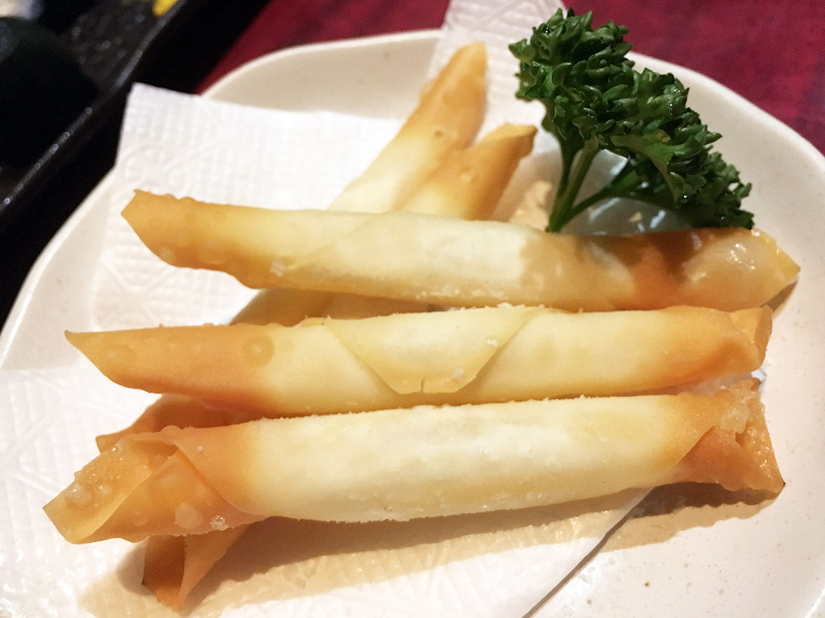 春巻きの皮に薄っすら衣?粉?もついてるのかしら、普通の揚げ春巻きよりさらにパリサク感しっかり。で、ぎっしり詰まった黒ごまやネギ入りのつくね(ミンチ)がジューシィ、食べ応えもある。