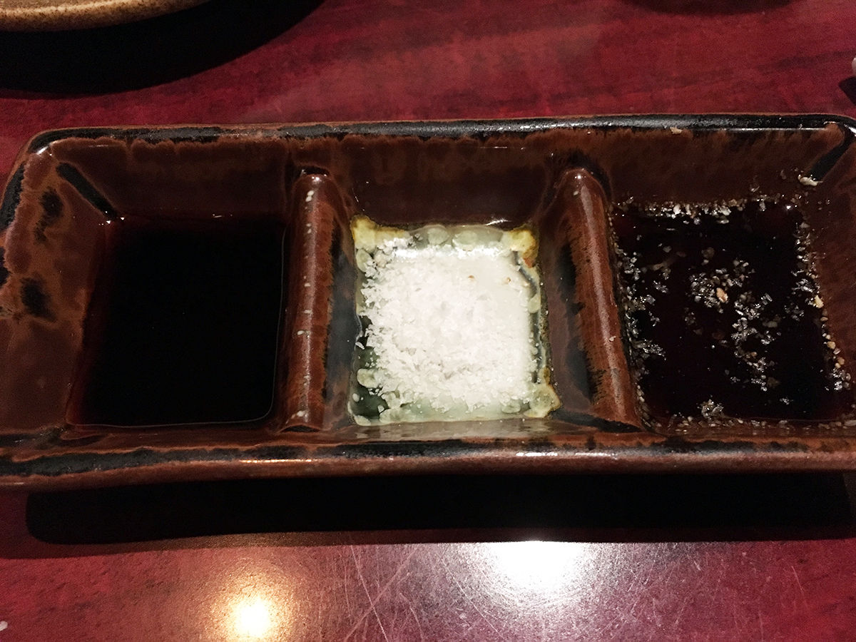 それぞれ、甘めのお醤油、ごま油&塩、タタキダレで。
