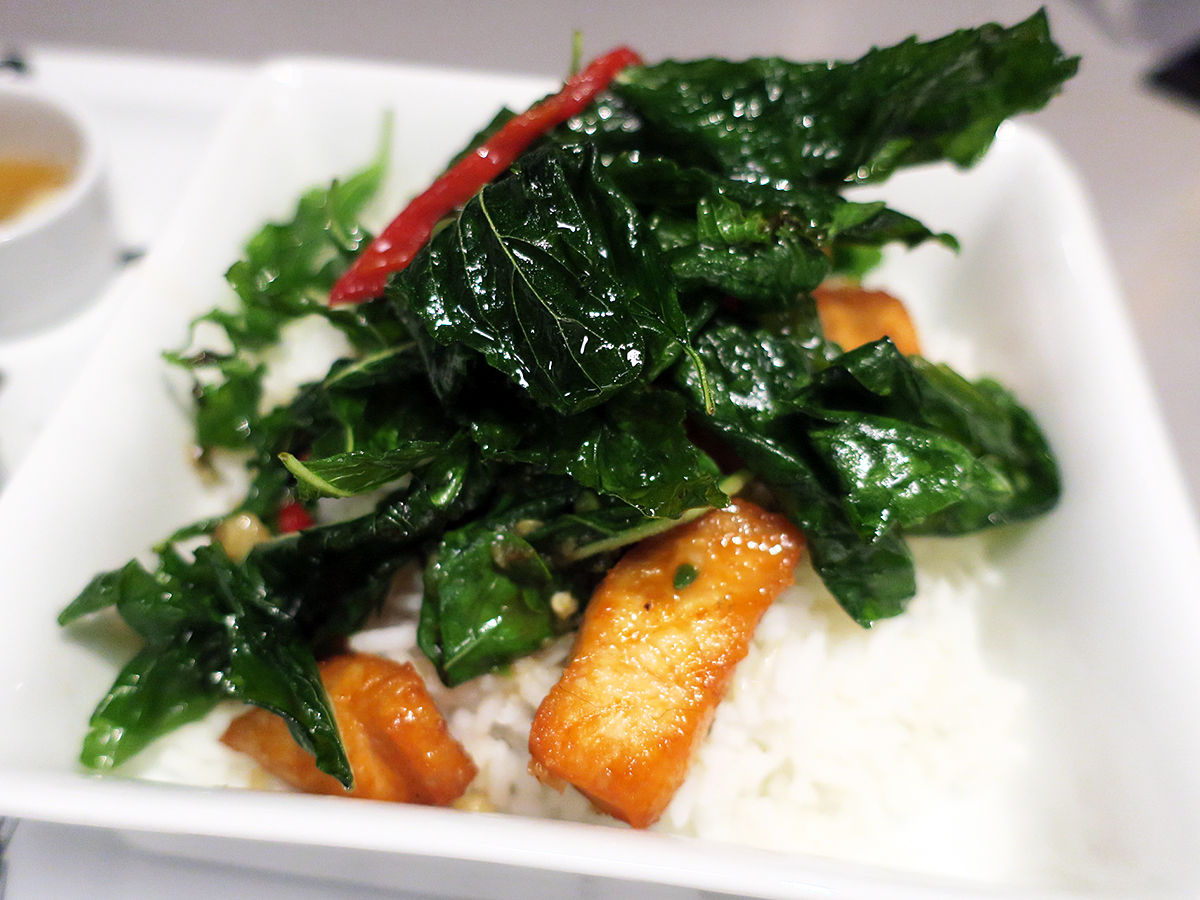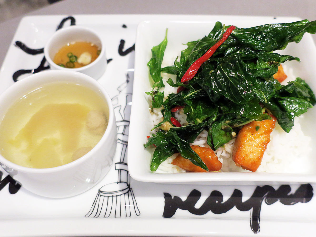 どんなんが出てくるか?と思ったらこんな感じ。揚げたか多目の油で揚げ焼きしたかだかのサーモン切り身と、タイのバジルと合わせ、ご飯に乗っけた一品。スタイリッシュ。
