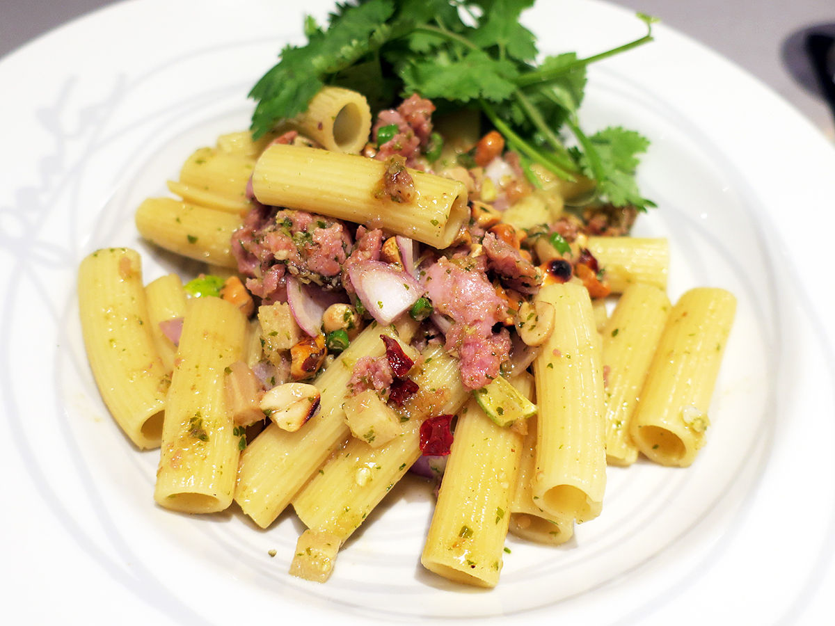 タイの発酵ソーセージ・ネームを使ったショートパスタ。