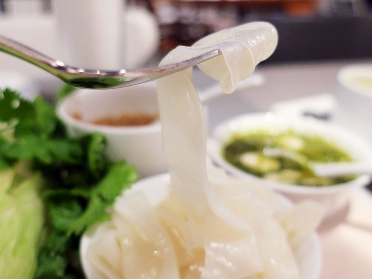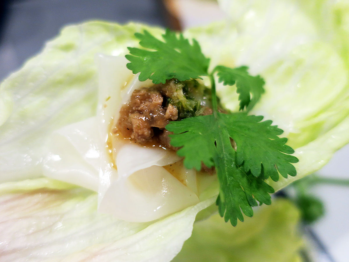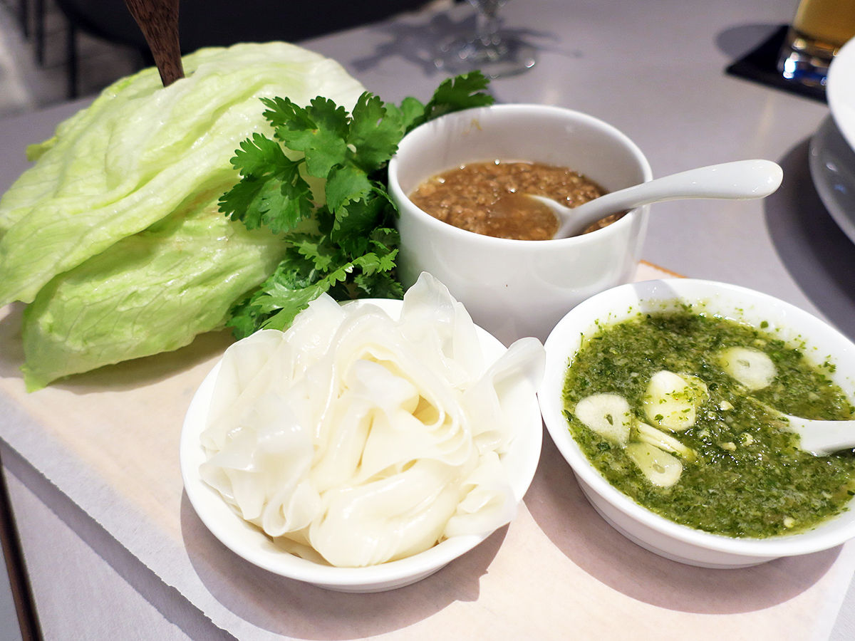 幅広平たい米粉麺をひき肉のピリ辛ソースとチリソースに絡めてレタス(+パクチー)に包んで食べるという前菜一品。