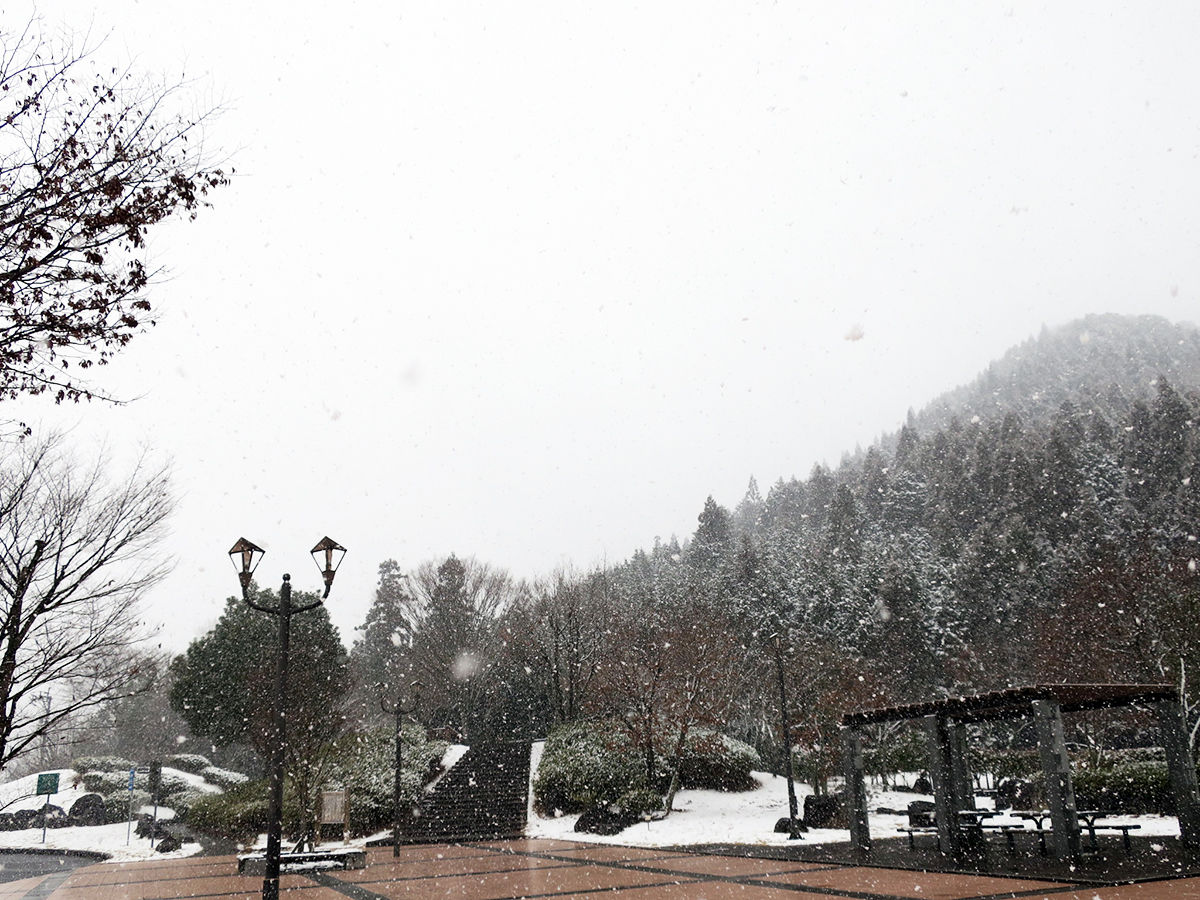 高速でちょっと休憩。立ち寄ったSAでは雪が舞う!今冬初めての雪が大分で、とは!