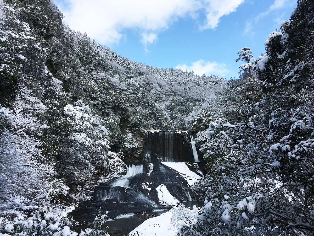 二段落としが豪快な滝。夏場には天然のウォータースライダーを目当てに多くの人々が訪れるそうです。さぞ楽しかろうね!
