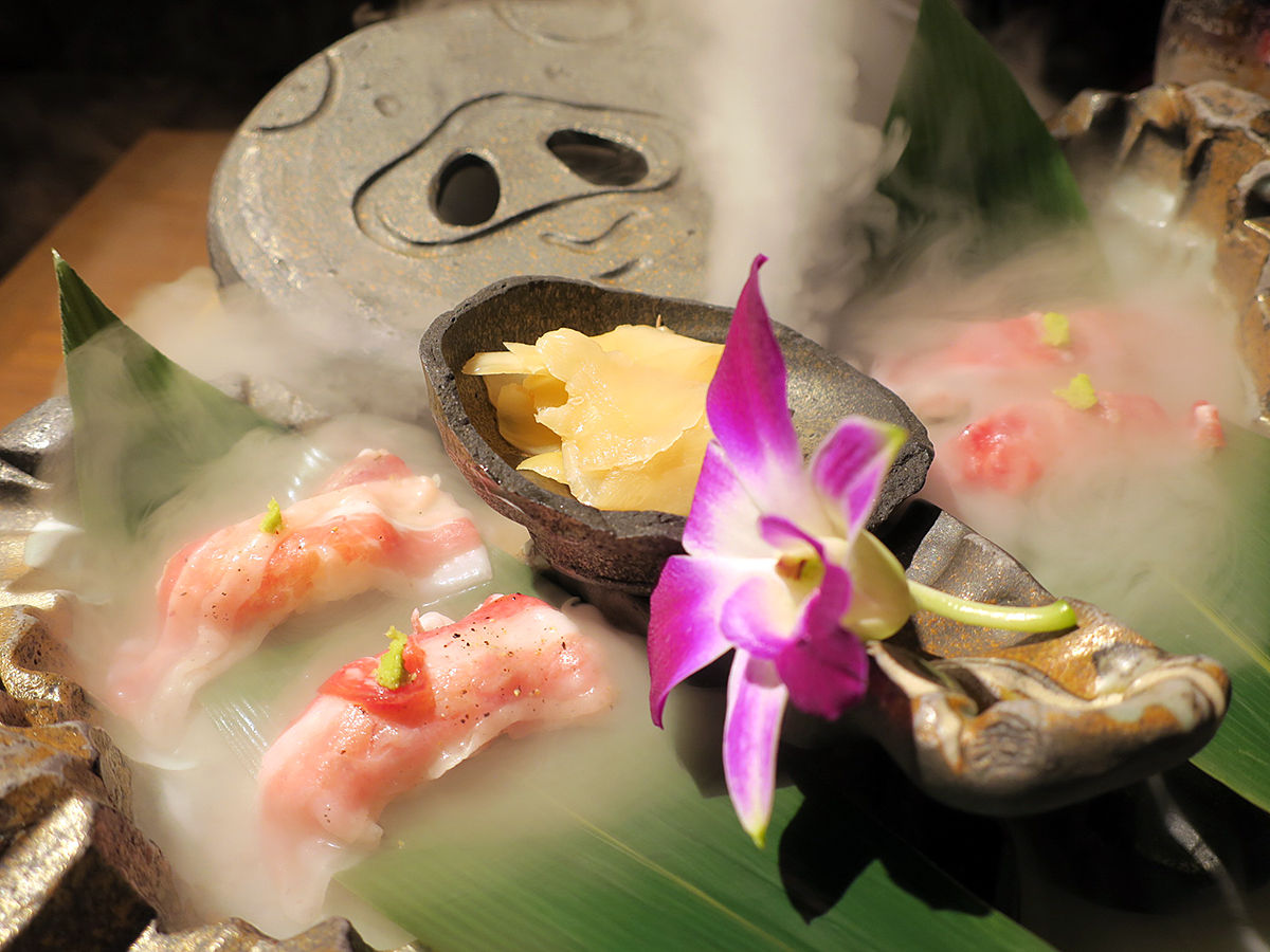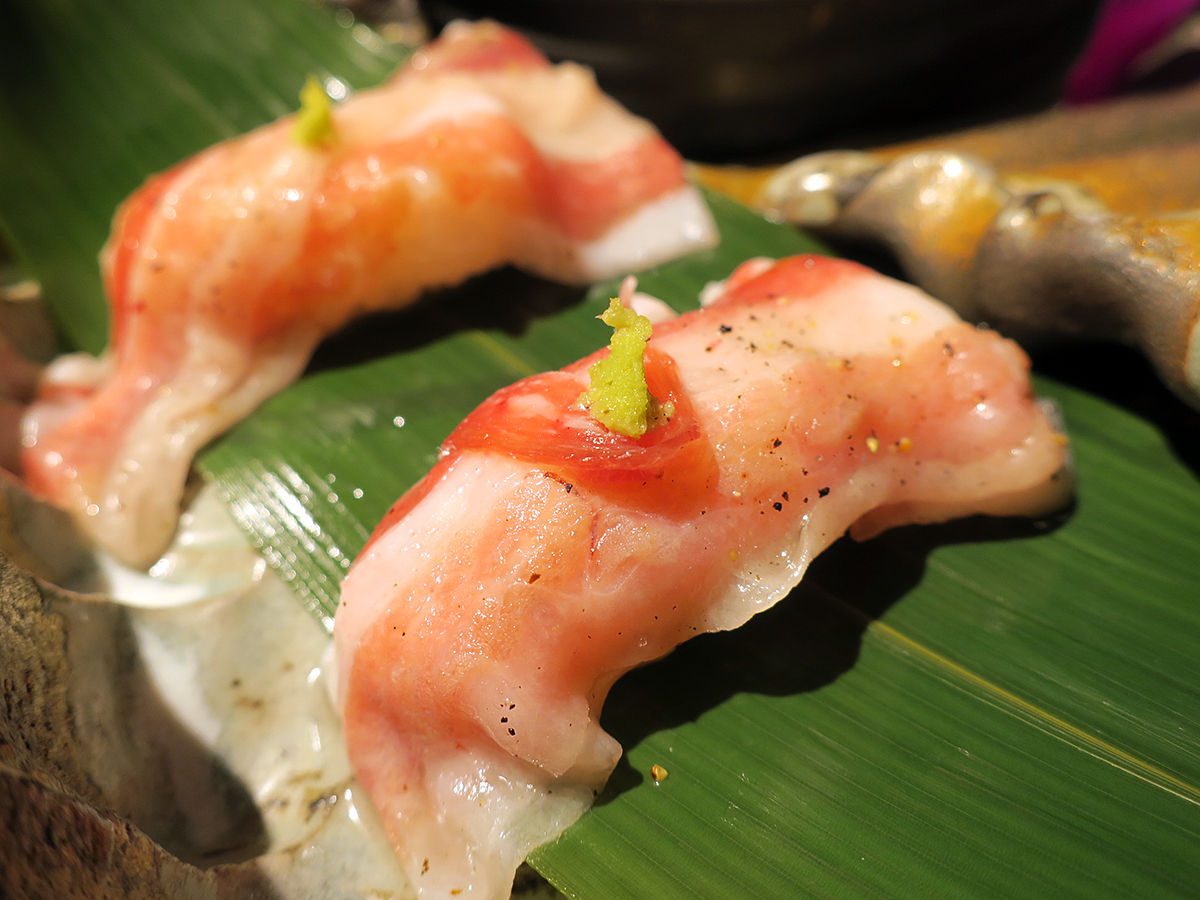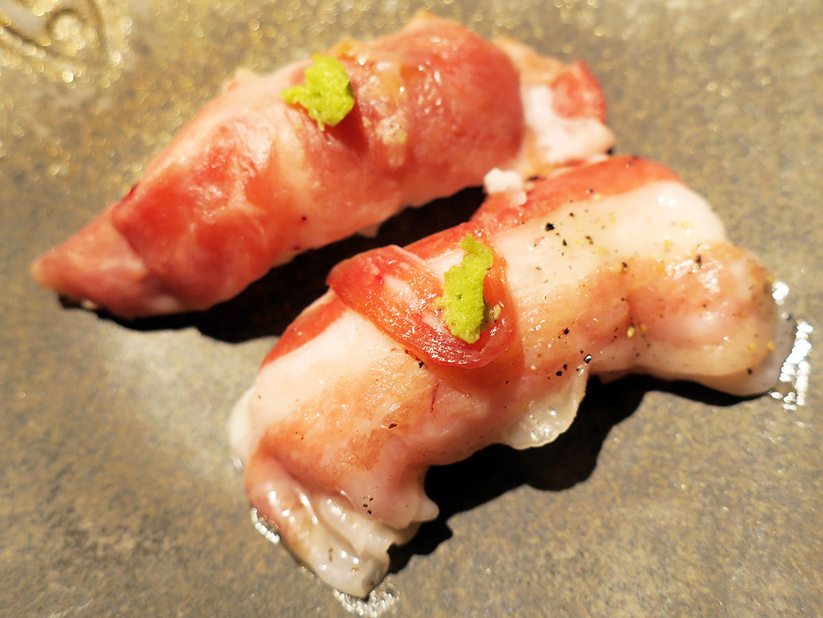 ひと口でパクッと頬張るとすぐに溶けちゃう!あまーい!!牛の寿司とは違うこの甘み、そしてイベリコ豚ならではの旨味。先のベーコンもそうだけど、なんせ脂身がおいしい。絶品。