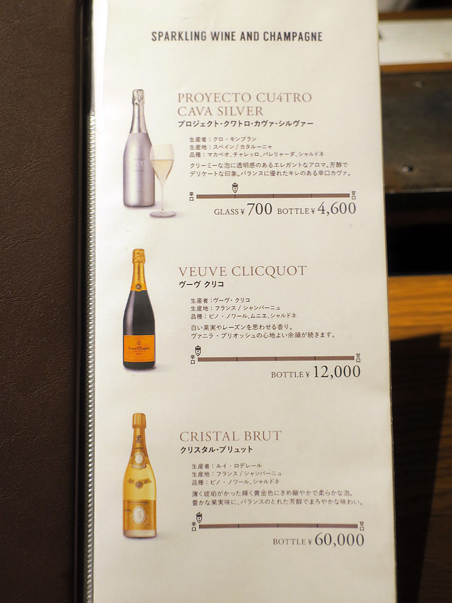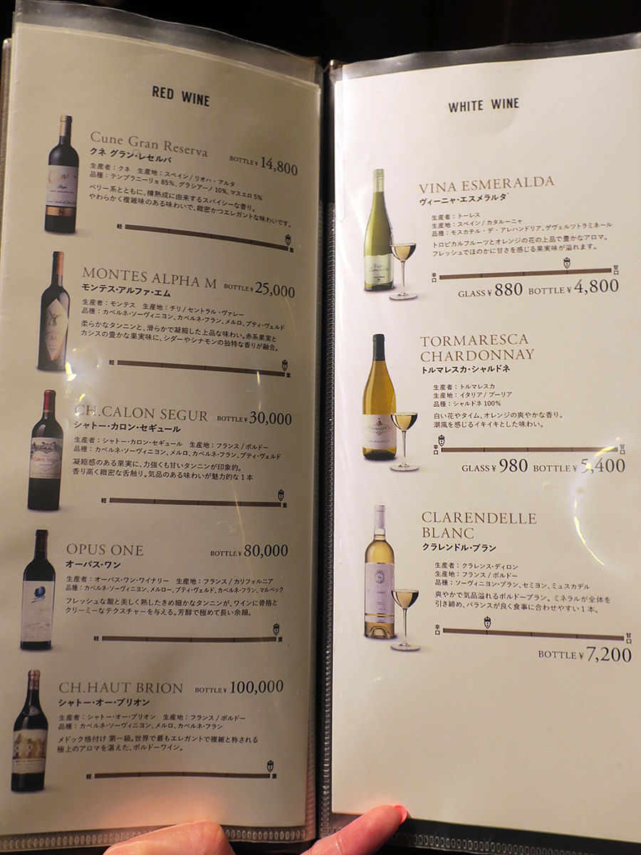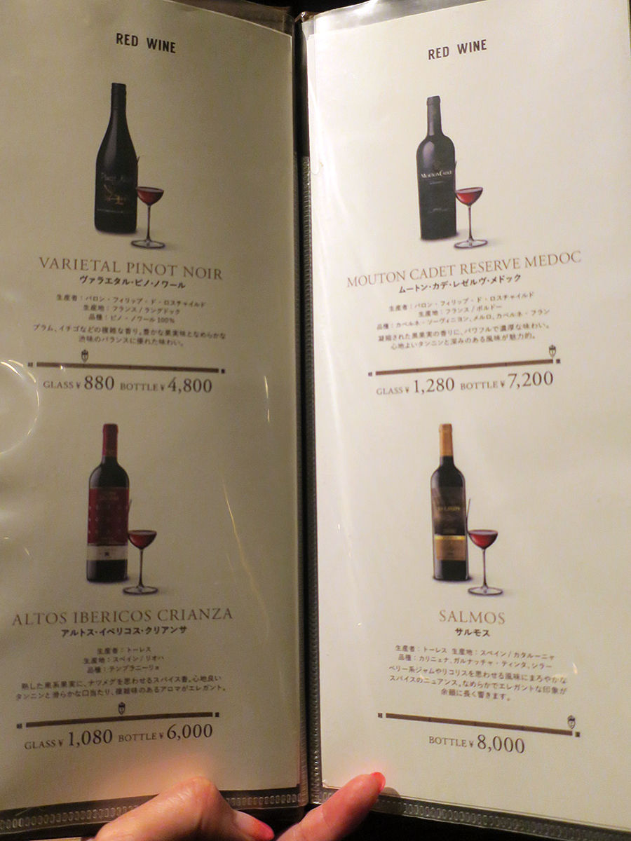 ワインは赤白ともにグラス¥880〜、ボトル¥4800〜