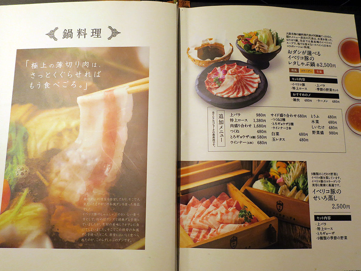 奥のテーブル席にオジャマしまして。メニューはズシリと重たいブックにて。イベリコ豚の一品あれこれが勢ぞろい。さすがのイベリコ豚専門店。コースも4種揃います。今回はアラカルトで色々いただきましょ。(詳細は記事最下部にてどうぞ)