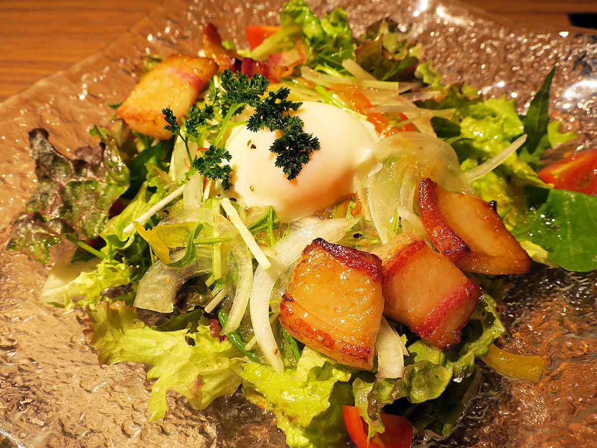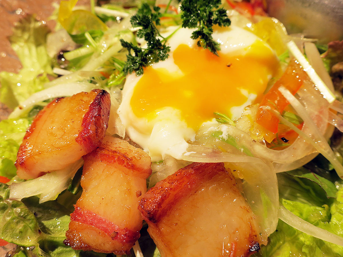 フレッシュ野菜に温玉と厚切りなイベリコ豚のベーコン。
