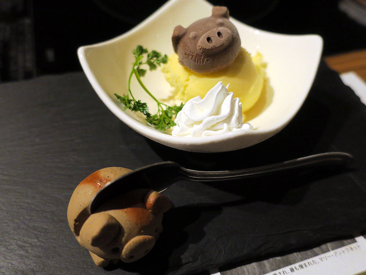 やはりのキュートな豚ちゃんが乗った、季節のアイス¥480で本〆。(スプーン置きも豚ちゃん!)