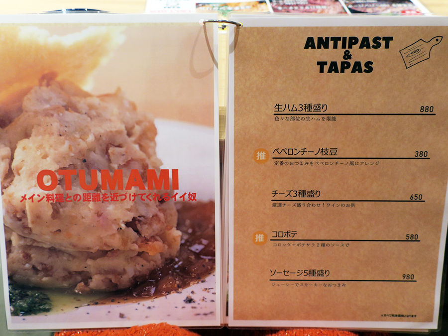 メニューは手元パウチにて。各種肉料理をメインに、前菜、タパス、サラダ、シメもん、デザート。ドリンクひと通り、肉に合わせてワインも充実。(詳細は記事最下部にてどうぞ)