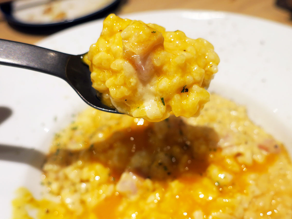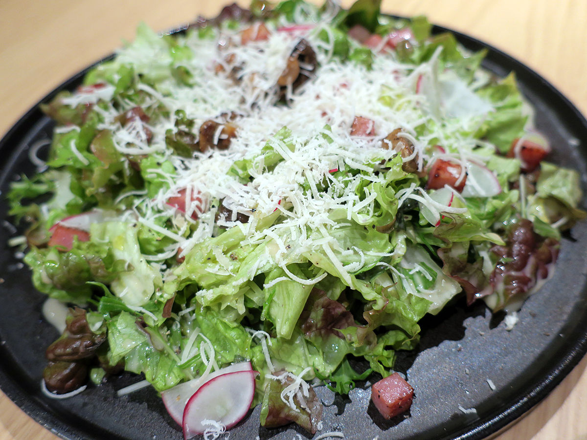 まずは野菜から。フレッシュ野菜、角切りベーコンに、目の前で「ストップ!」言うまでたっぷりかけられるチーズ。ドレッシングはいわゆるシーザーサラダよりもあっさり目かな、チーズが引き立つし、飽きずにモリモリ食べられる。
