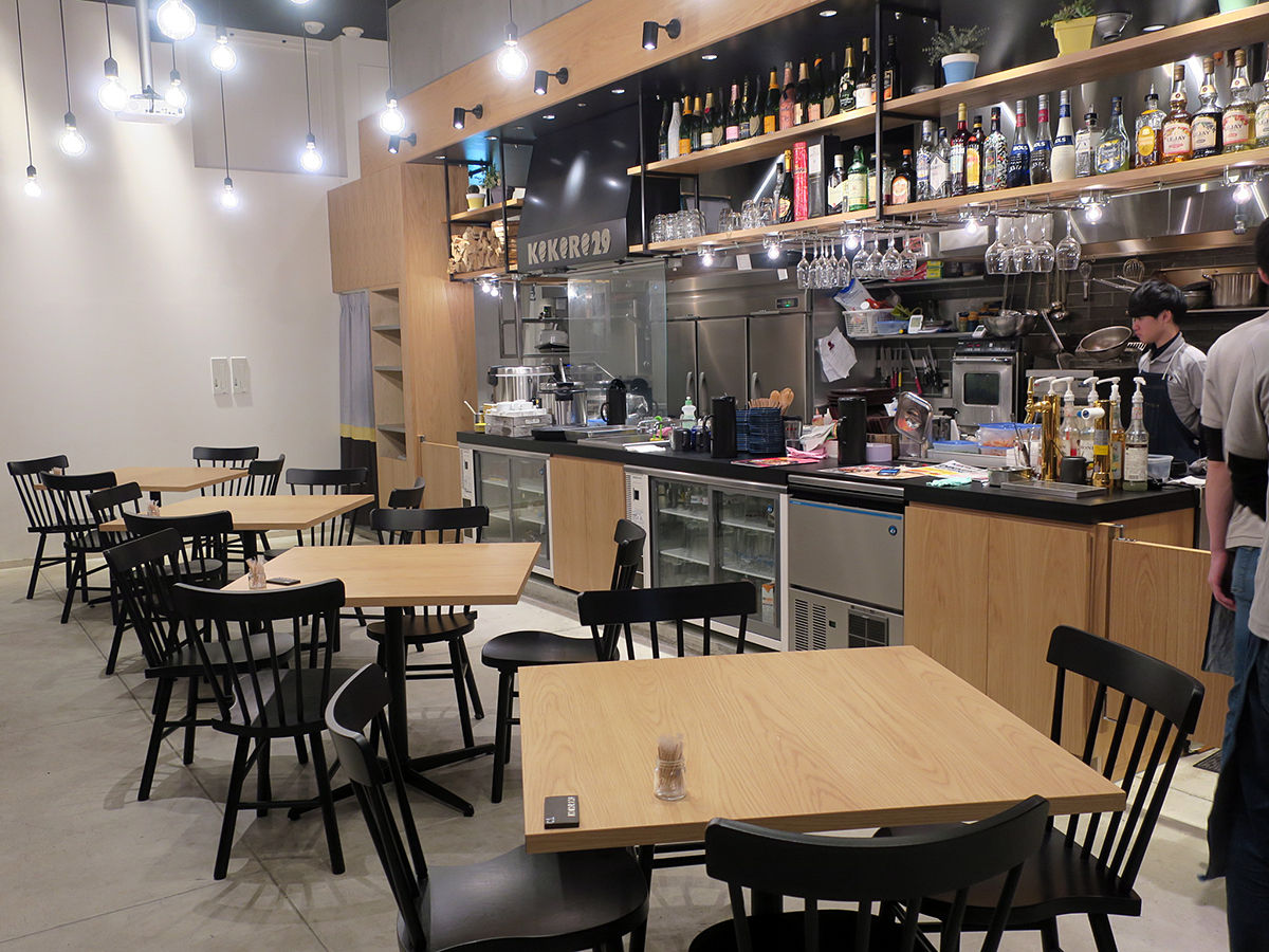 ガラス張りの店内は、広くとられたオープンキッチンに向かうテーブル席。木を基調とし、壁面に緑があしらわれるナチュラル系。壁際のソファ席にオジャマしまして。