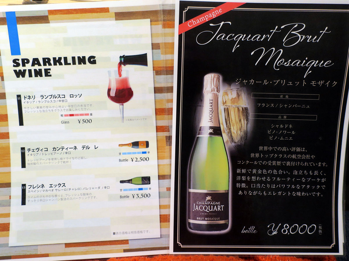 ワインのグラス提供は赤・白・泡それぞれ1種ずつ。ボトルは¥2800〜。