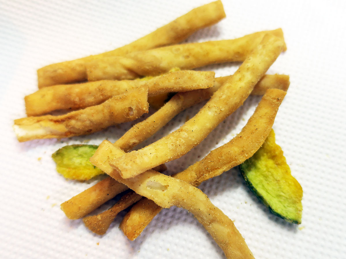 密度低めのかりんとうのようなカリザクッとした歯ごたえに、なるほどなるほど、いわゆるほうとうの味噌醤油系な味わい。ほうとうの具に必須のカボチャと、人参チップスも入ってます。割と地味だけどあったら手が伸びるやつ。