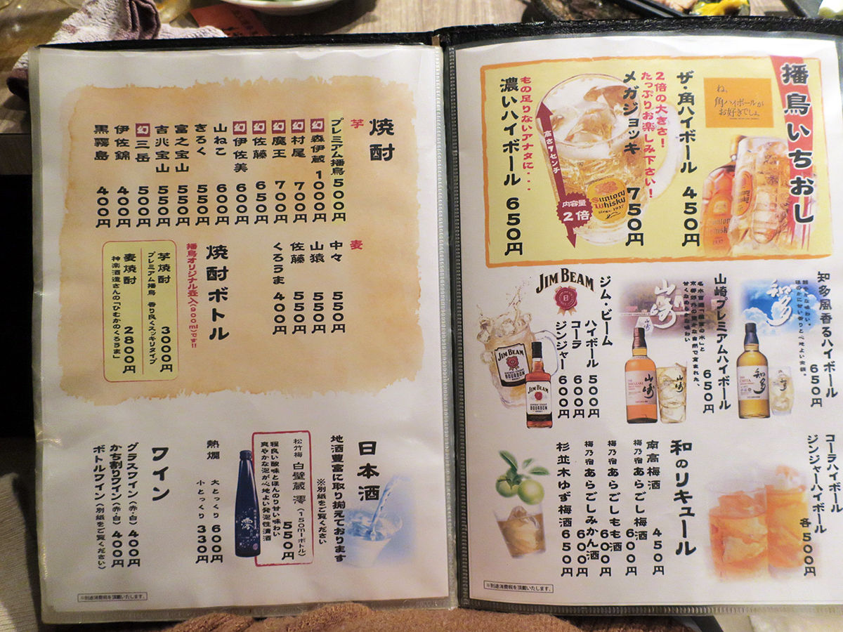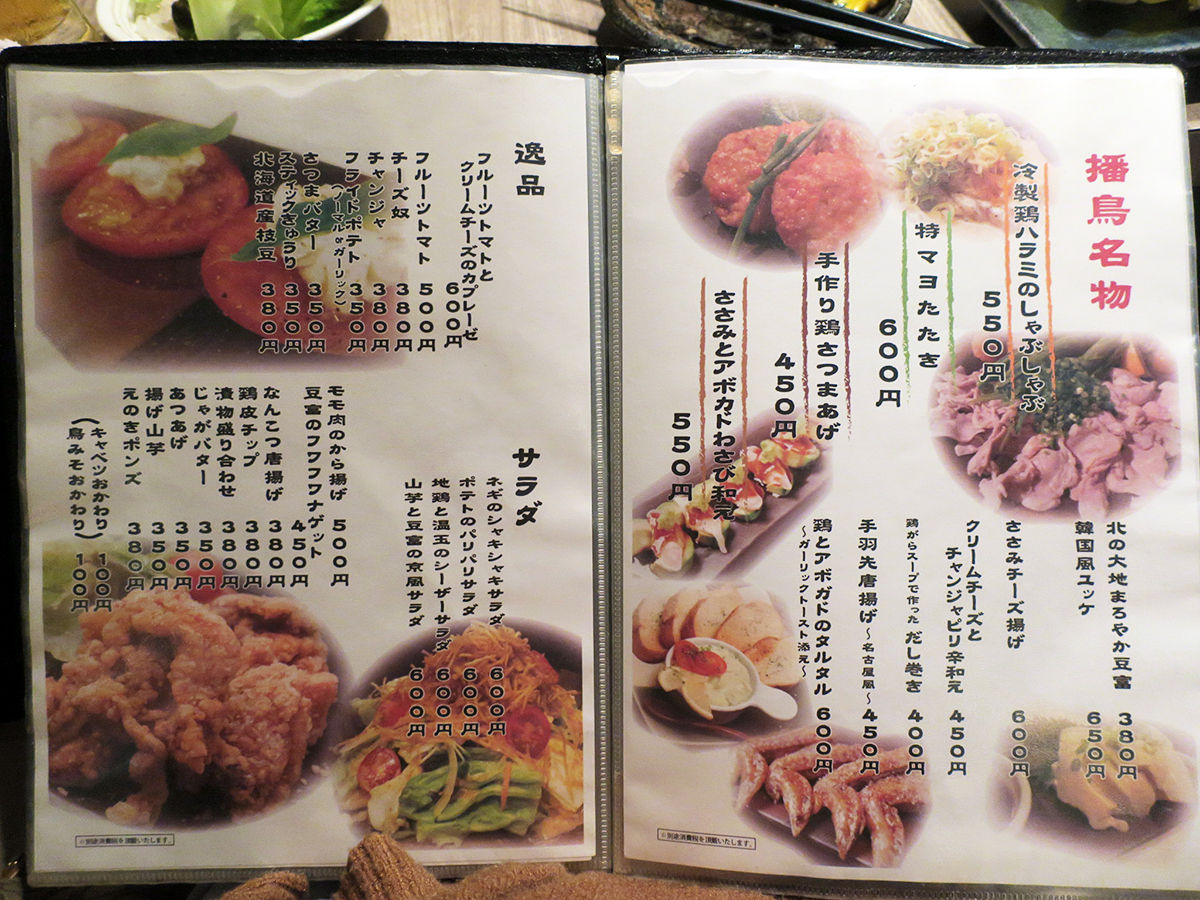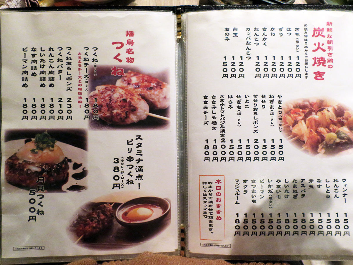 メニューは手元ブックにて。ドリンクひと通り、焼酎も日本酒もワインも豊富。お料理は串焼きや焼きもんメインにおつまみ一品、サラダ、揚げもんなど、鳥料理プラスαもスタンバイ。(詳細は記事最下部にてどうぞ)