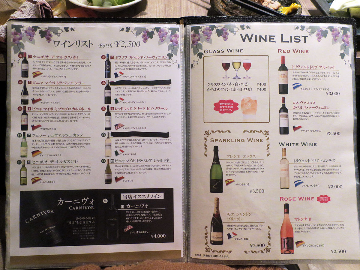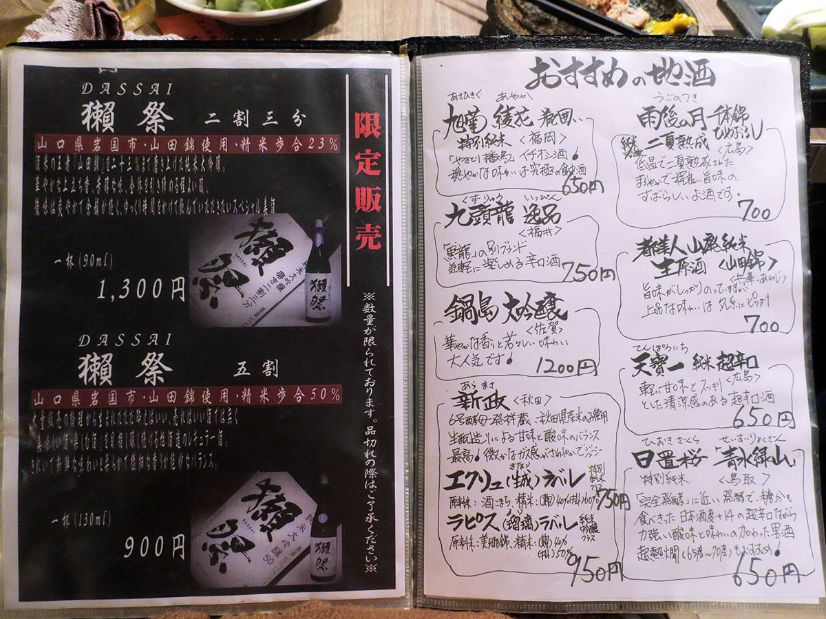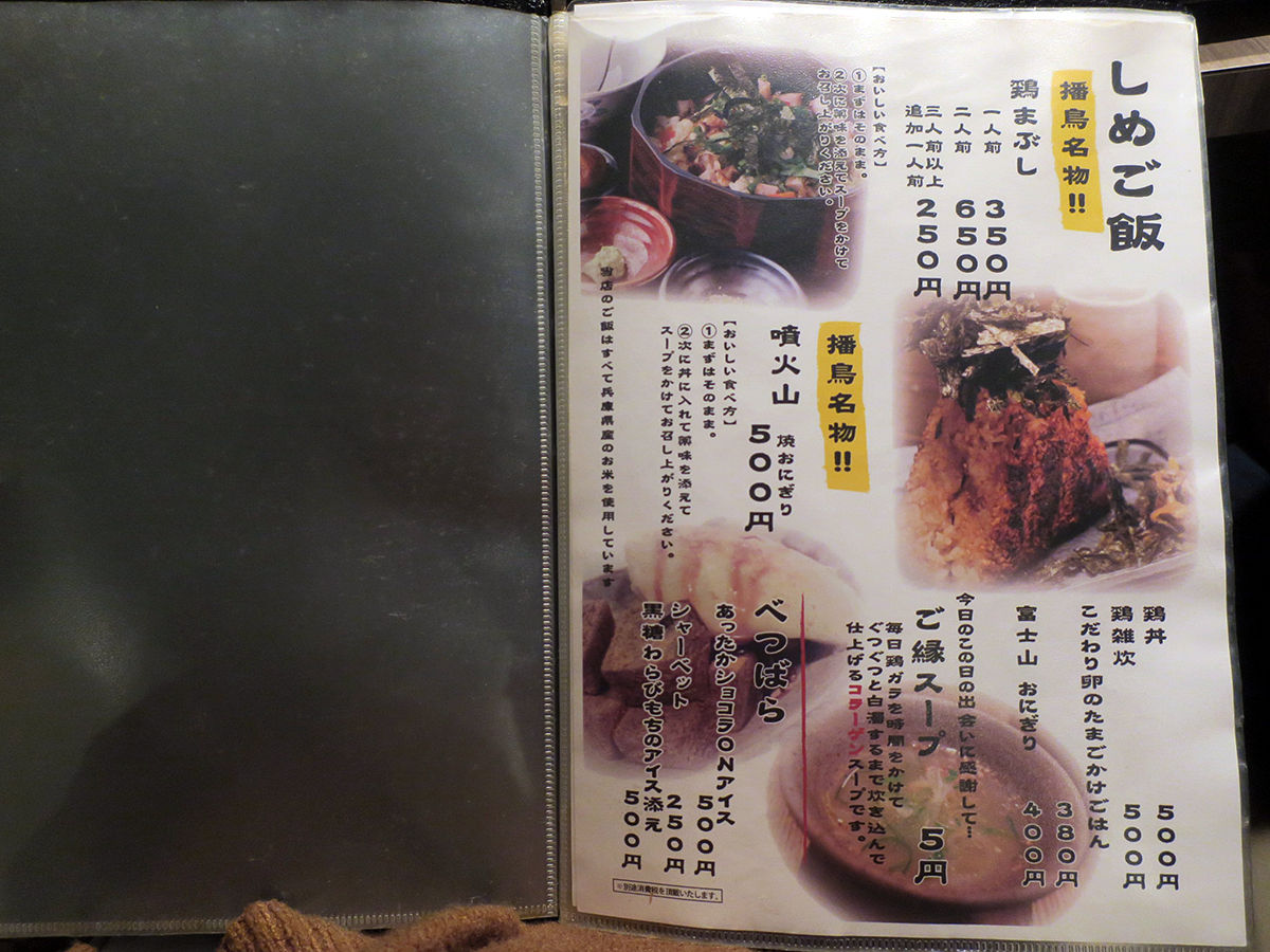 メニューは手元ブックにて。ドリンクひと通り、焼酎も日本酒もワインも豊富。お料理は串焼きや焼きもんメインにおつまみ一品、サラダ、揚げもんなど、鳥料理プラスαもスタンバイ。(詳細は記事最下部にてどうぞ)