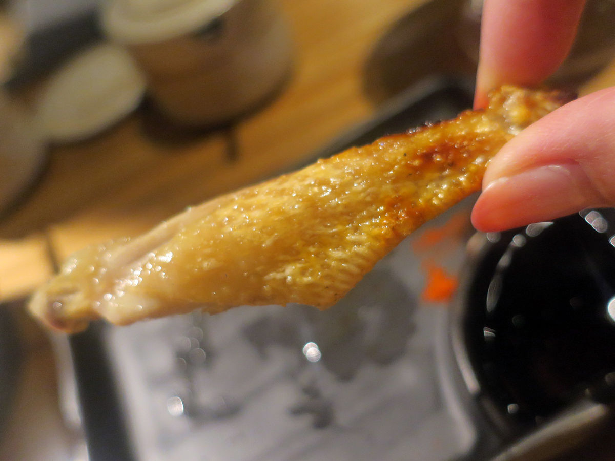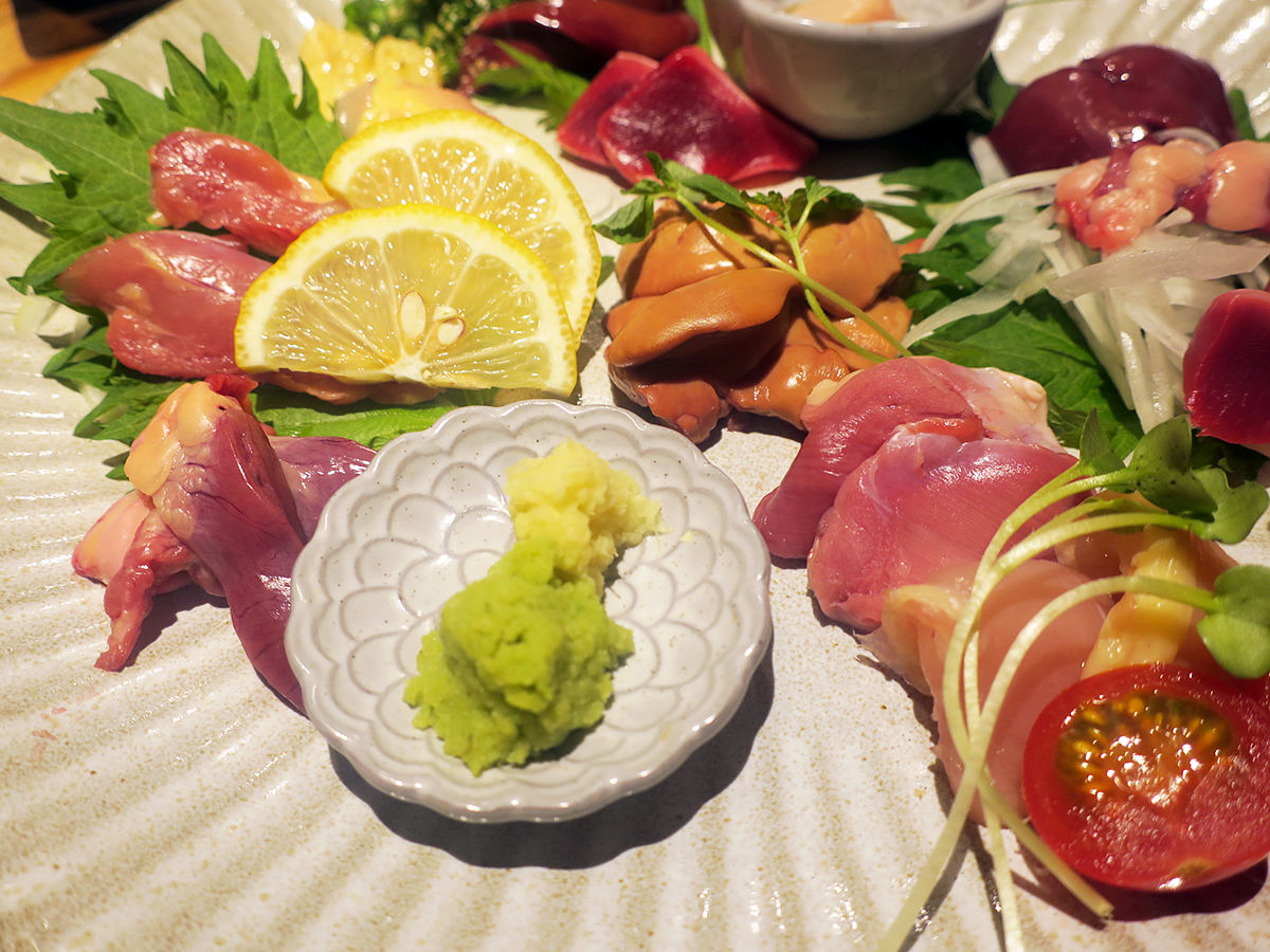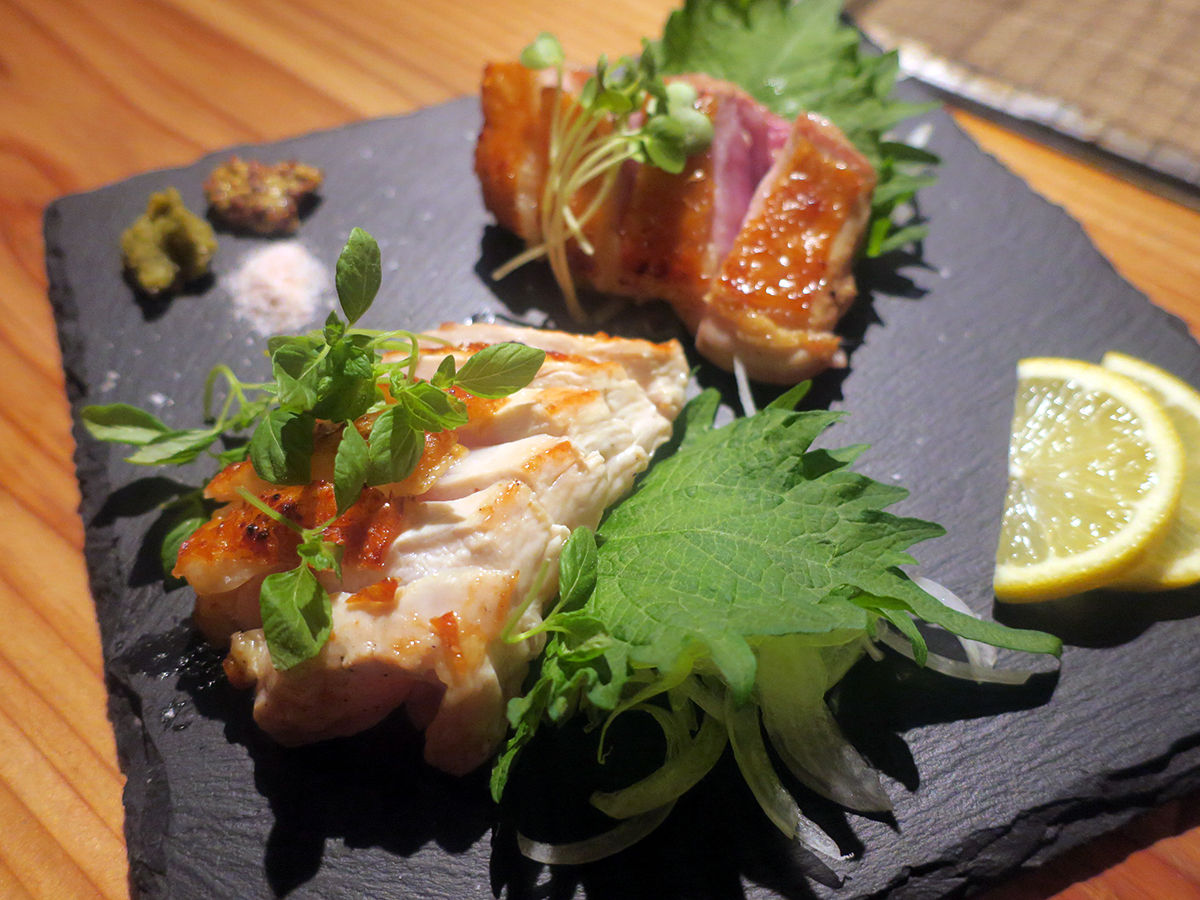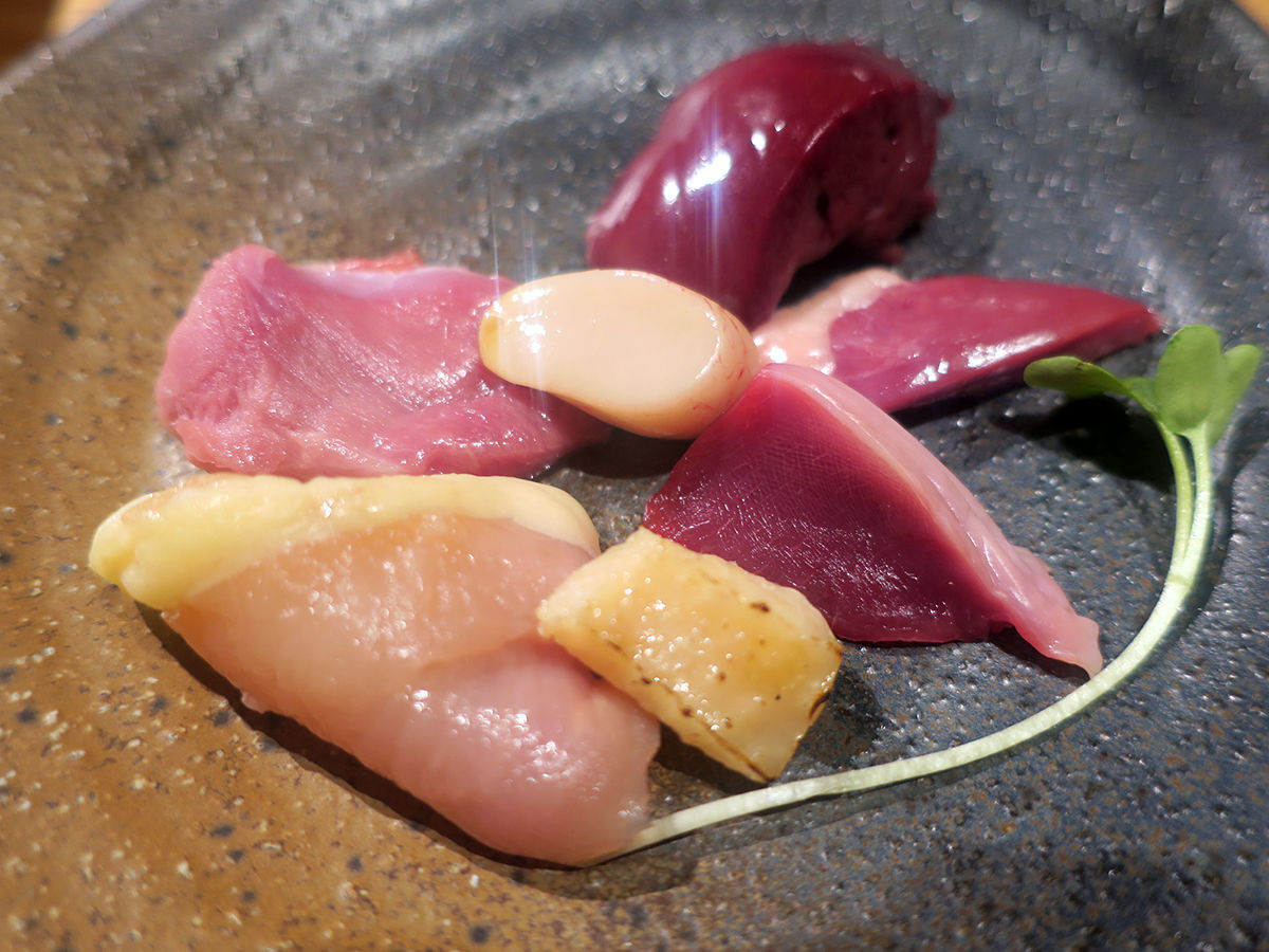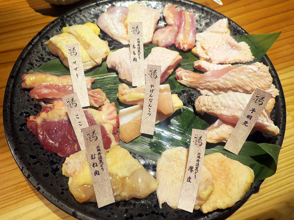 お店で提供される鶏は通常、京都の『地鶏丹波黒どり』がメインだけど、週に数回他の鶏も入りこの日は奈良の『大和肉鶏』も合わせて食べ比べ。右半分が奈良、左半分が京都。ワクワク〜っ