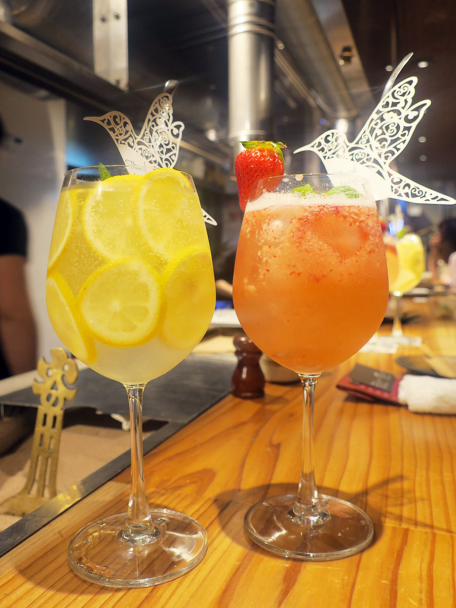乾杯はキュートなお酒!カワイー!!定番のレモンと、季節の果物は苺。