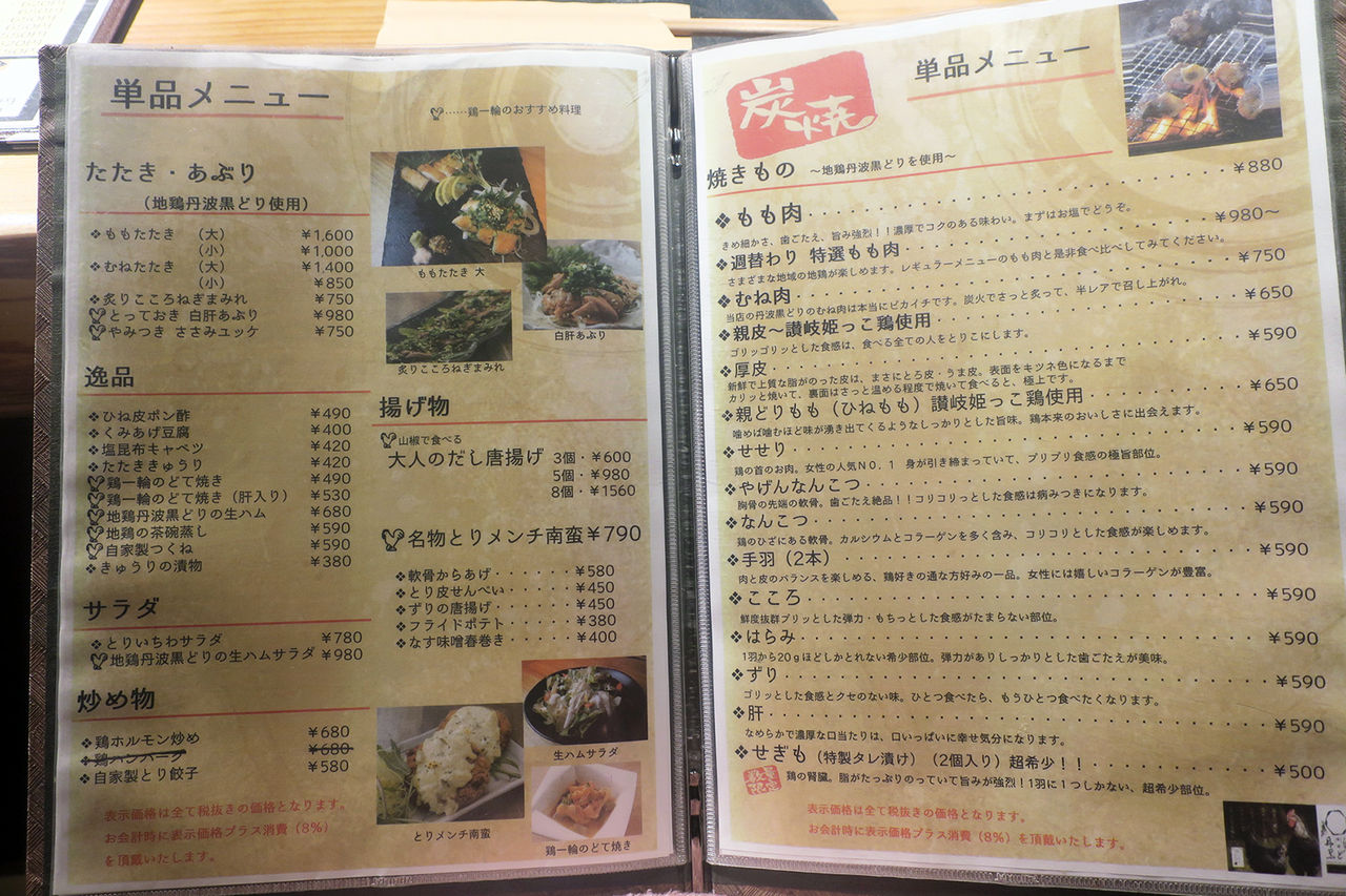 カウンターにオジャマしまして。メニューは手元ブックにて。鶏の炭火焼きをメインにお造り、一品、揚げもん、炒めもん、釜めしなどが揃います。その他、すき焼きやしゃぶしゃぶは前日までの予約が必要。(詳細は記事最下部にてどうぞ)