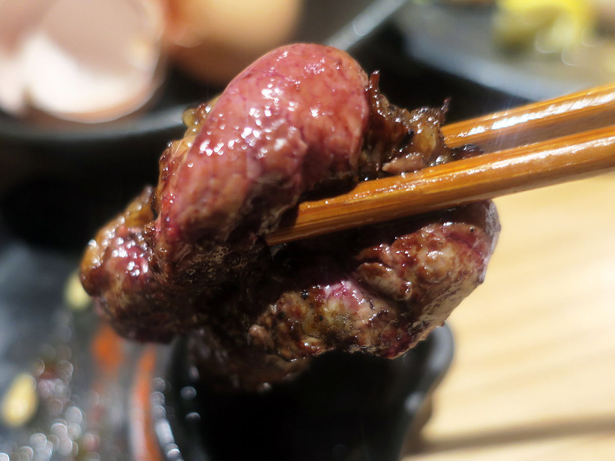 別皿で添えられる希少なキラッキラの背肝。特製のタレに漬かったそれをサッと炙って。