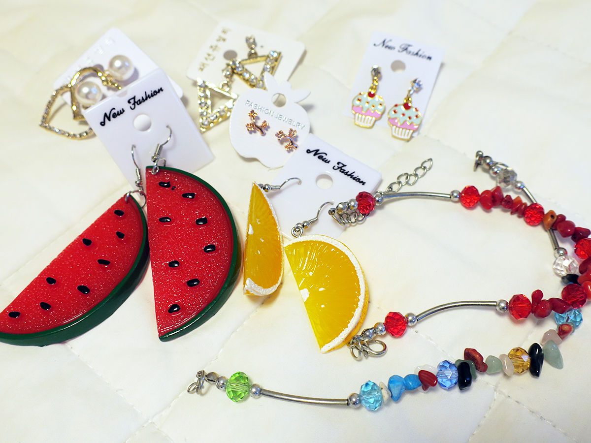 それぞれ、バンコクの市場とパタヤのナイトマーケットで購入。ピアスは4つで100バーツ(約360円)というのが多い。安い!