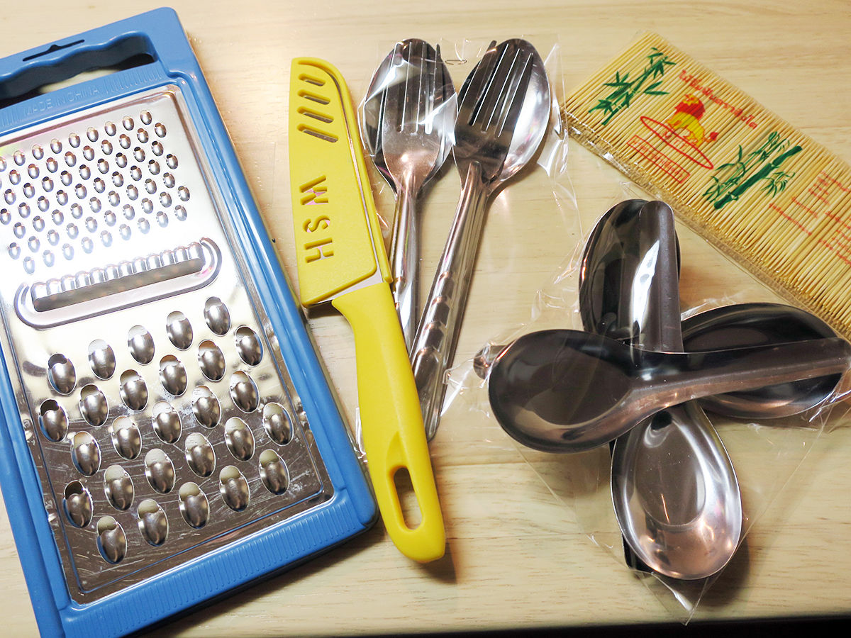 バンコクの市場(以下に紹介)の一角の100均ならぬ10バーツ(約¥36)ショップ(写真1枚目)と調理器具屋さん(写真2枚目)で購入。