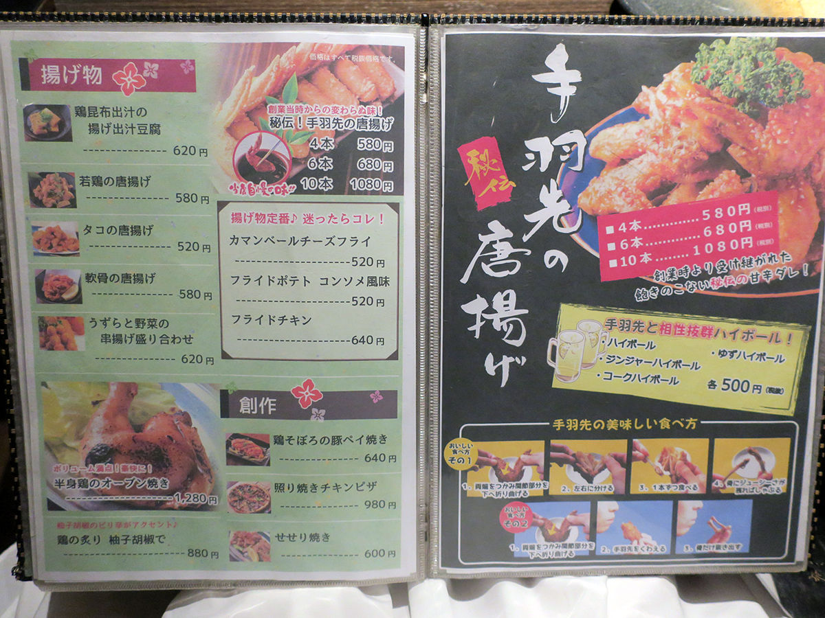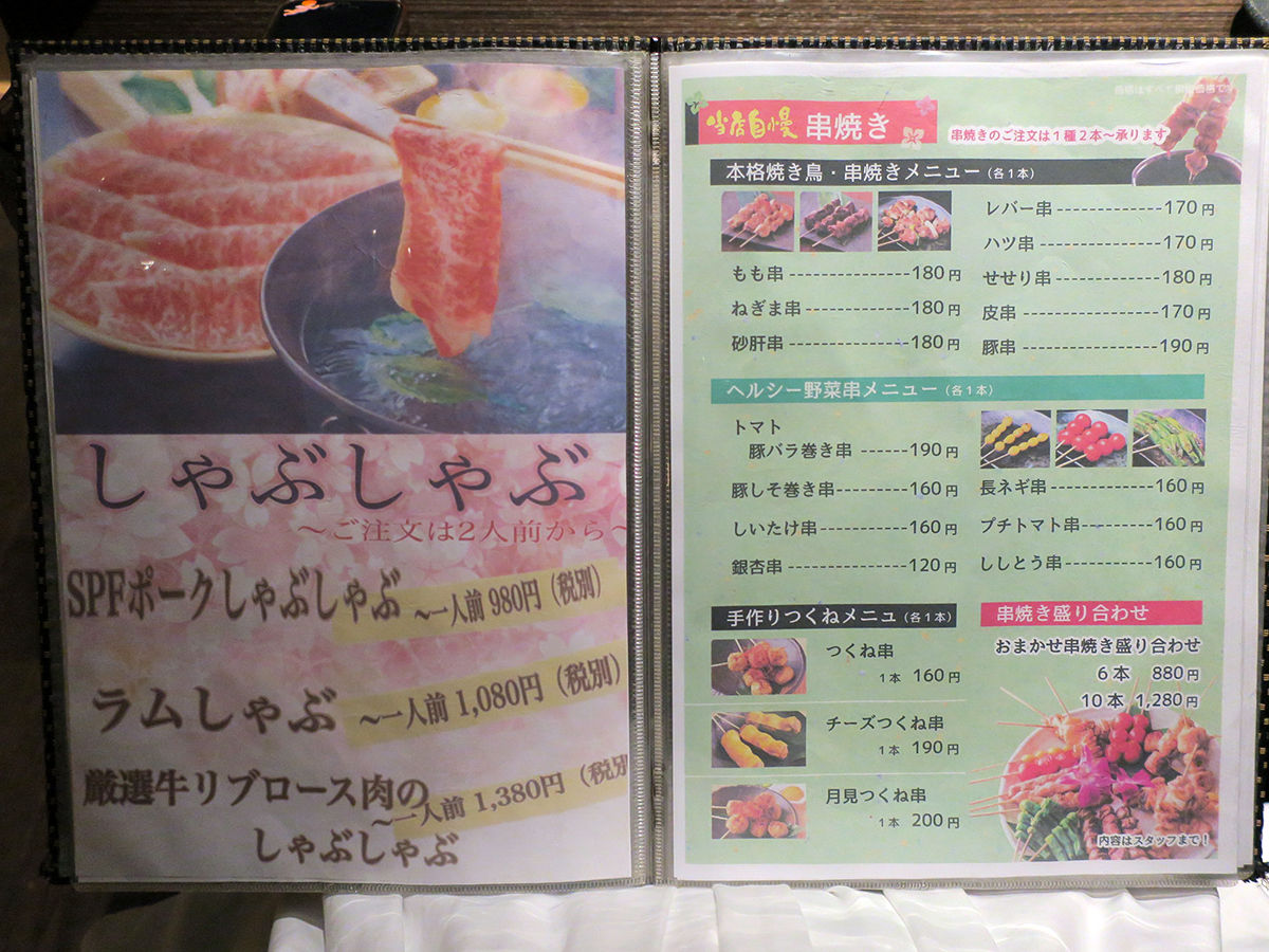 で、ご案内いただいたテーブル席。メニューは手元ブックにて。串焼きやしゃぶしゃぶメインにその他和洋折衷なお料理がスタンバイ(詳細は記事最下部にてどうぞ。以下、記載価格は全て税別。)