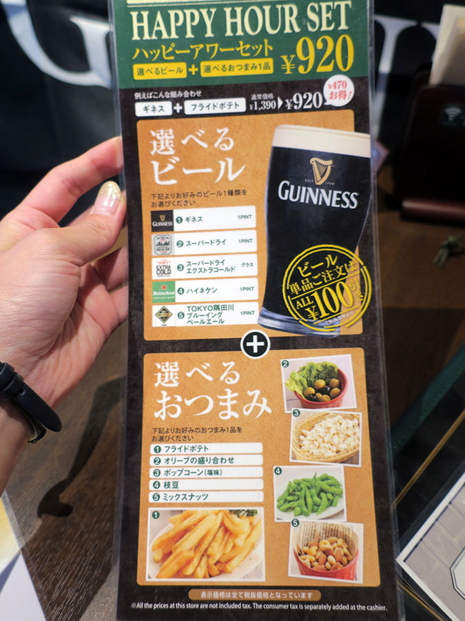 19時までのハッピーアワーでは生ビールが¥100オフ!その他、指定のドリンクも30%オフとお得。まぁこれに惹かれて入ったわけで。
