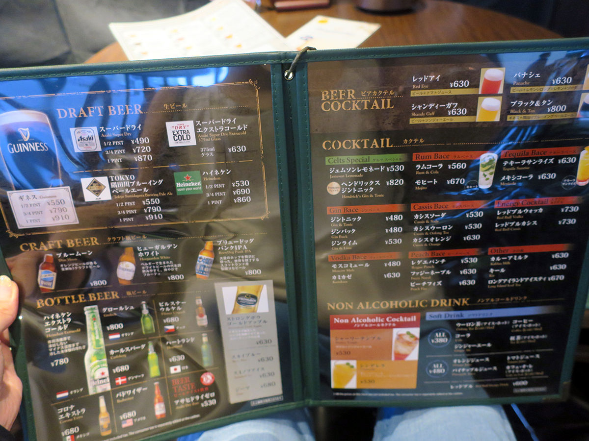 メニューは手元ブックとパウチにて。ドリンクはパブらしく、ビール、カクテル、ウイスキーが豊富。フードもお酒に合うおつまみ系なラインナップ。(詳細は記事最下部にてどうぞ)