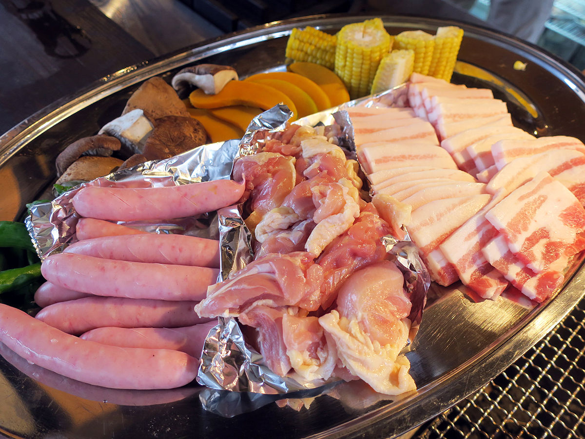 和牛以外にも、豚バラ、チキン、ソーセージ、焼き野菜などなど内容盛りだくさん。
