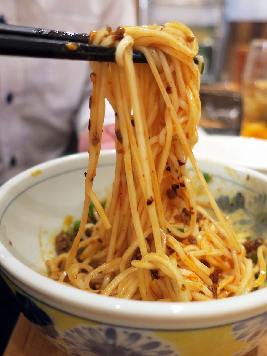 ちょっと太めの冷や麦のようなしなやかな麺に、甘辛なひき肉とラー油が絡む〜