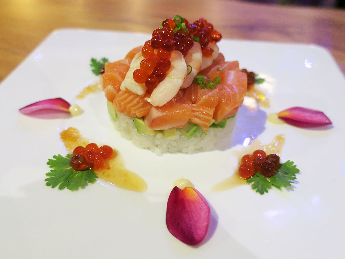 ジャパンな一品もひとつ。ちゃんと酢飯にアボカド・サーモン・海老・イクラ。花びらやパクチーで飾られ。お味もまあ悪くない。けど、日本で食べるより俄然お高いですw