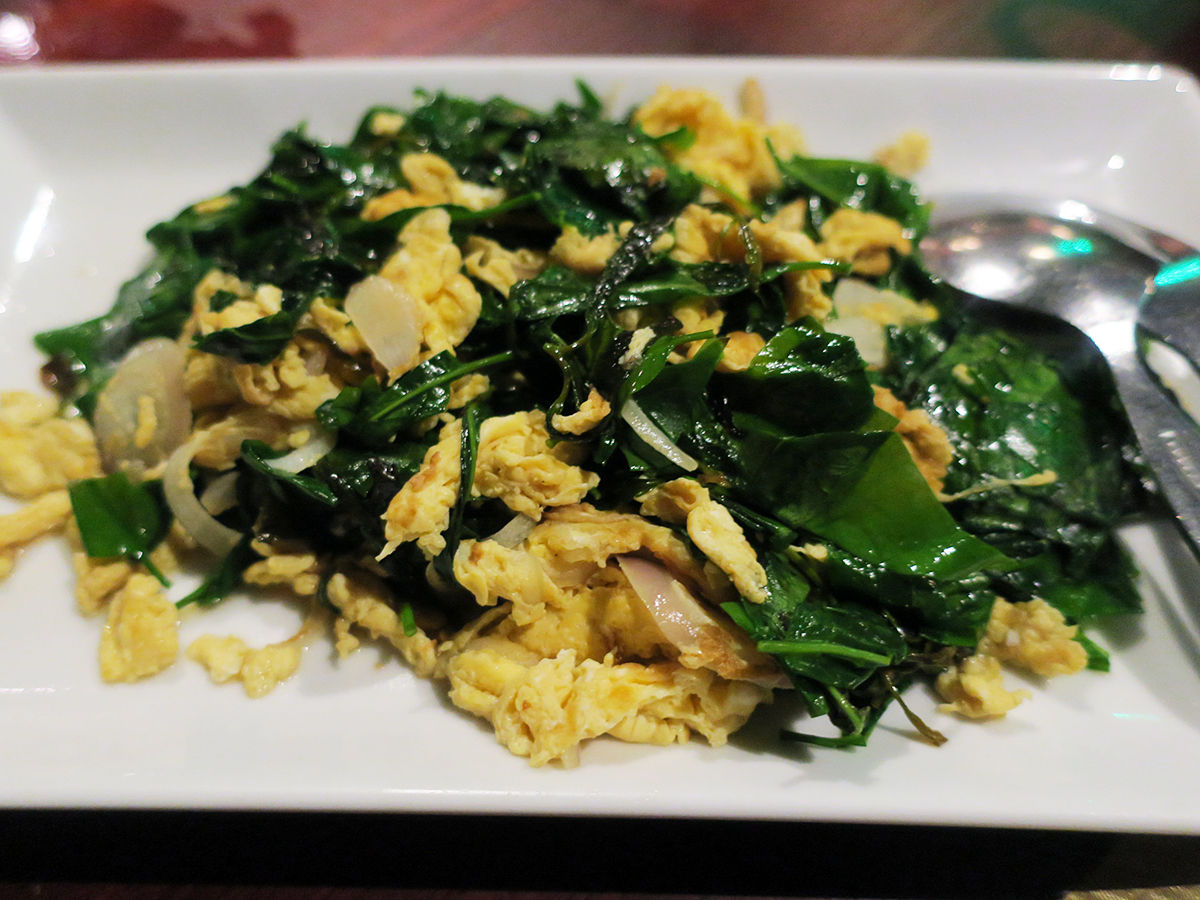 タイ南部でよく食べられるバイリアン(グネモンの葉と呼ばれる)という葉っぱと卵の炒め物