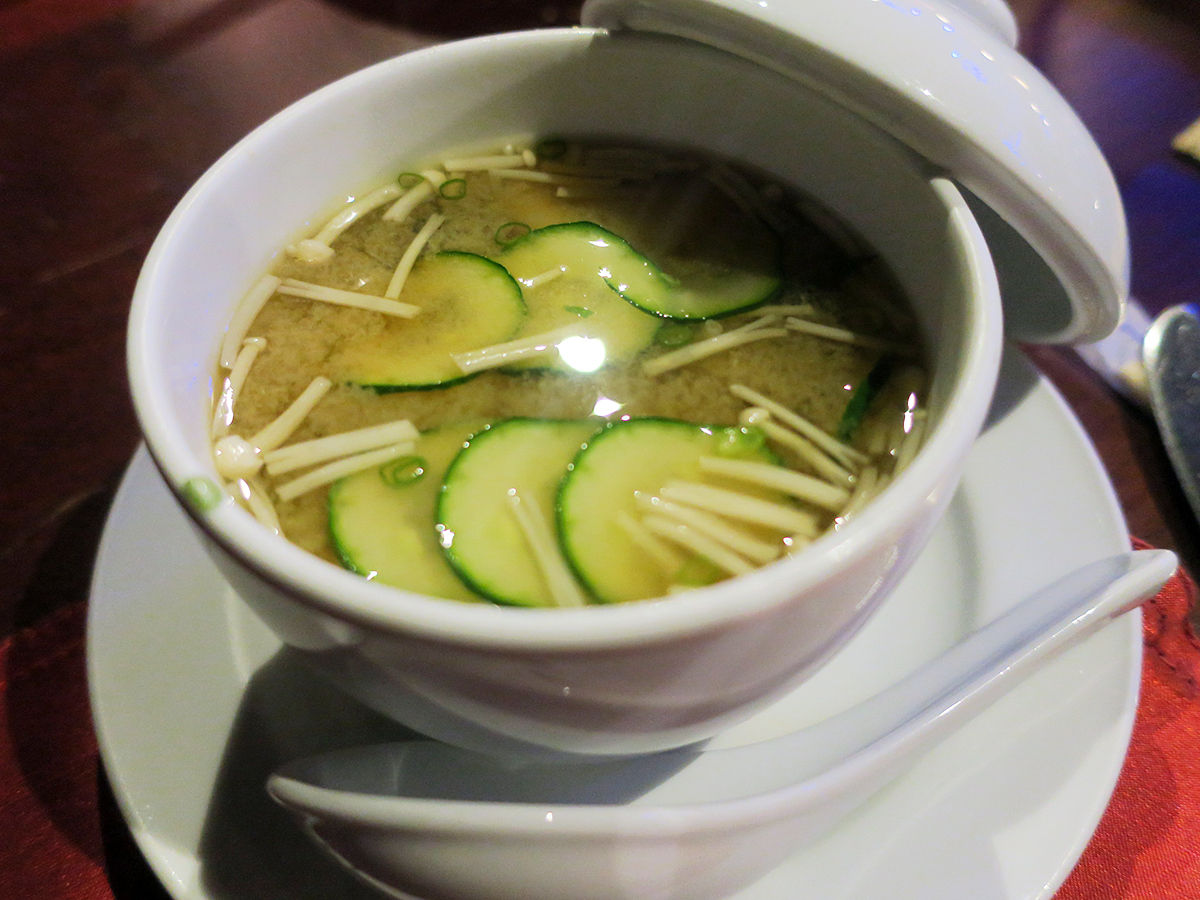 お寿司に合わせオーダーしたお味噌汁は、お豆腐、わかめ、えのきにキュウリとイカが入る(笑)でも味はちゃんとお味噌汁でした〜
