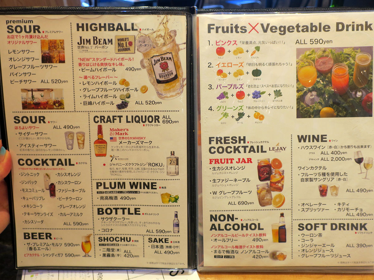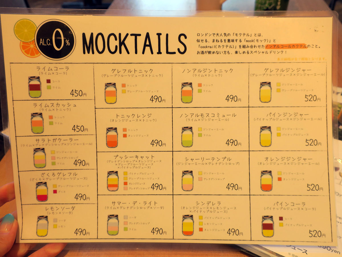 メニューは手元ブックにて。ドリンクは定番ひと通りに加え、フルーツ&野菜のお酒カクテルあり、流行りのノンアルカクテル・モクテルありで、女子好みな感じ。