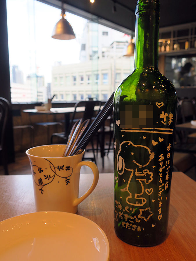 予約して伺うと、案内された席にはウェルカムのメッセージボトルが。こーゆうちょっとしたおもてなし、嬉しい♪(まぁ予約してくれたお友達の名前が書かれているワケだけど。笑)