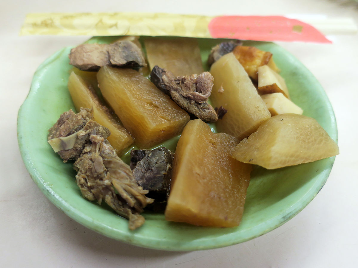 内容は日によってガラリと変わる根菜メインの煮物。この日は大根と魚の血合い。なーんの飾りっ気もない盛り付けもどこか和む(笑)
