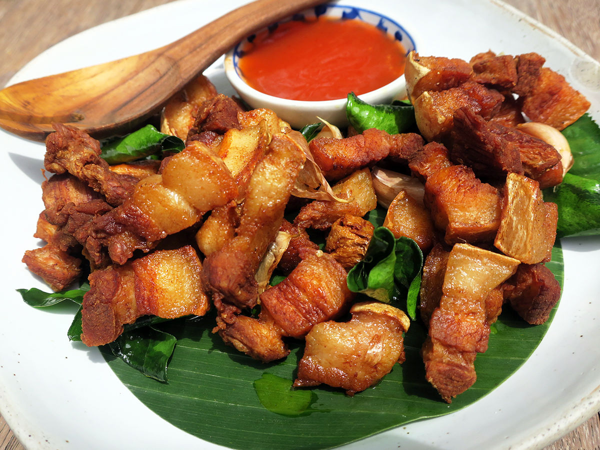 魚揚げたん。プラー・トード=揚げ魚。お店によって丸ごと一匹とかもあるけど、こちらはお上品目に切り身で。それを濃口醤油に浸してある。辛さはなし。外側はパリッとしていて、中はめちゃしっとり。日本人の口にも合う仕様で、白飯にもめちゃ合う。