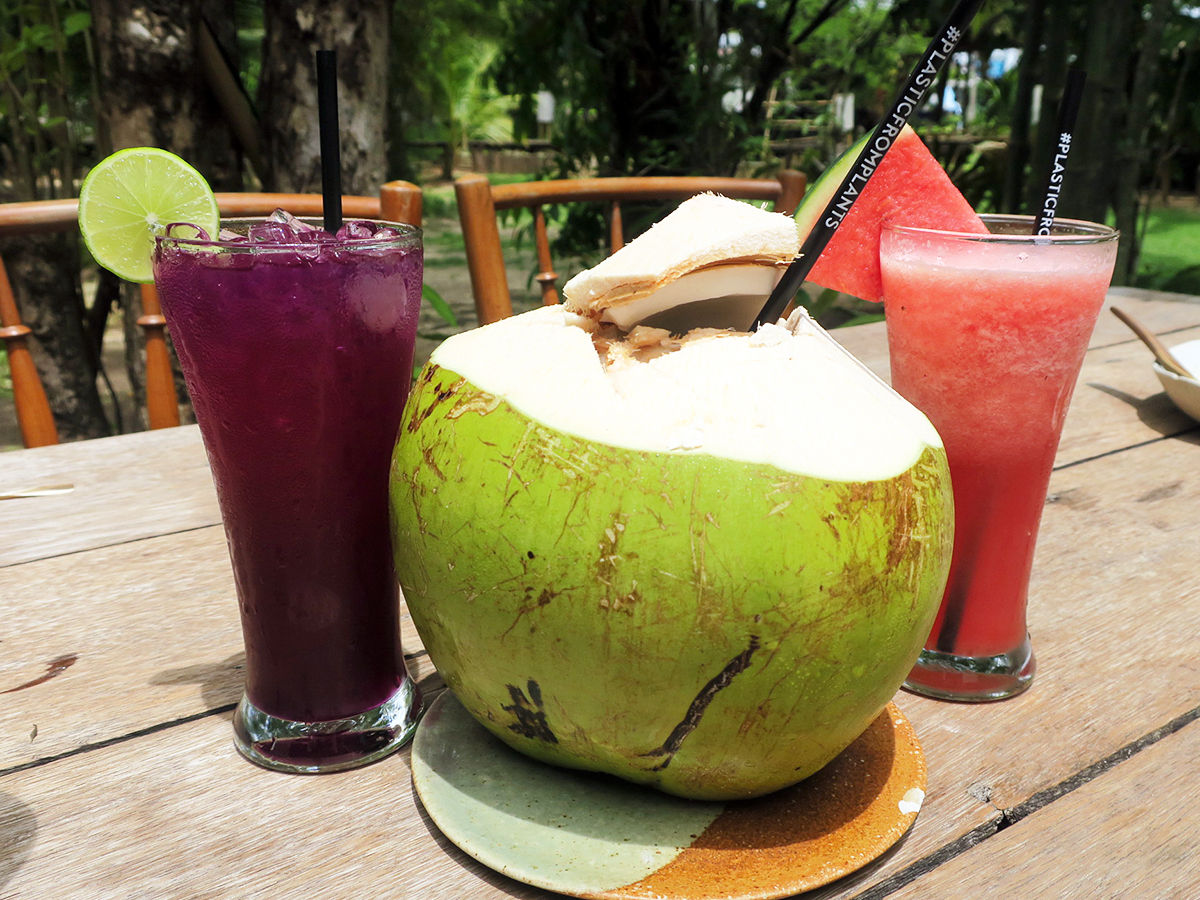 飲めない・飲まない人はジュース。丸ごとココナッツジュースや搾りたて超フレッシュなスイカジュース、色が変わるバタフライピー。