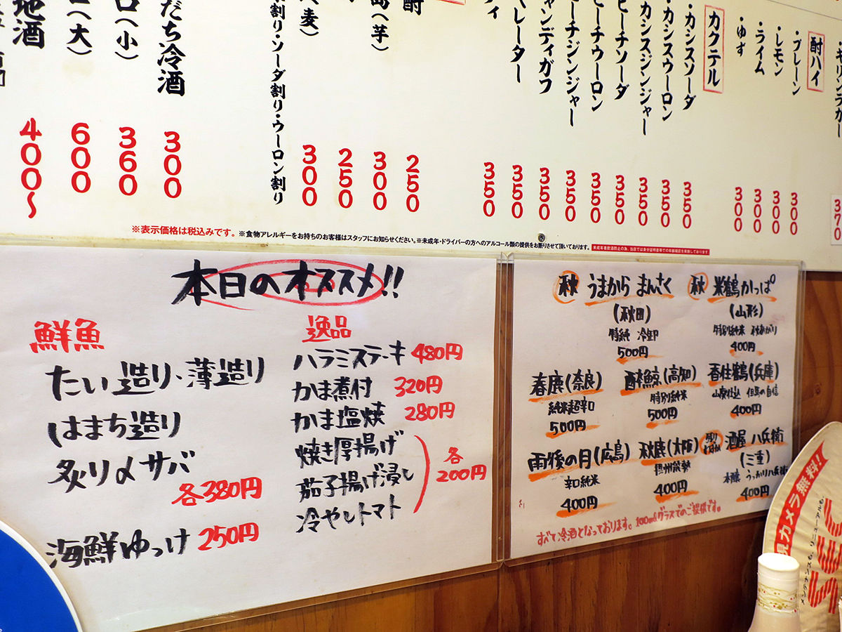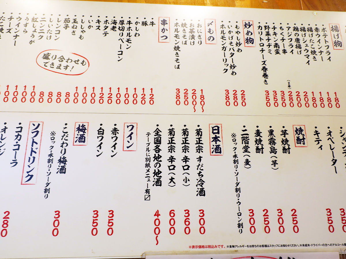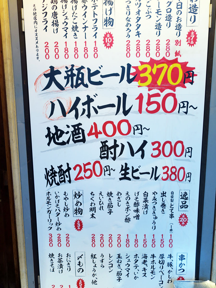 メニューは目の前壁にて。お造り、サラダ、おつまみ一品、串かつ、揚げもん、炒めもんなどなかなか豊富でなんせ安い。ドリンクも比較的リーズナブルで、大瓶ビールは¥370!以前は少し値上がりして¥400だったけど、最近値下げしたようで。この立地でこの価格は本当に頭が下がります!(以下、価格は税込。)