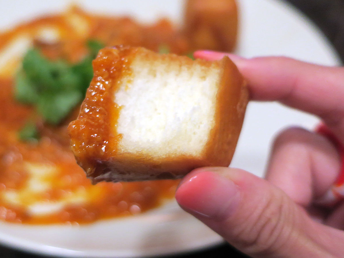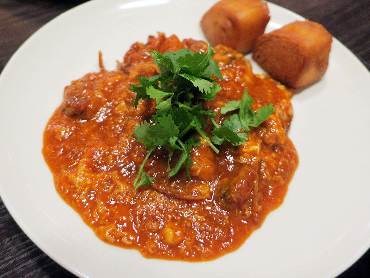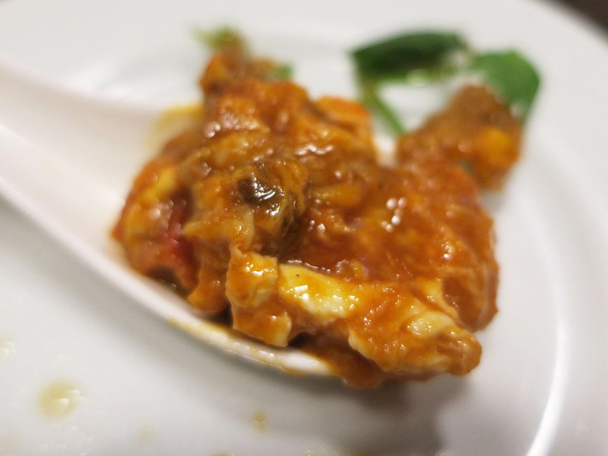 殻ごと食べられる小さなカニ、エビチリ風な味わいに卵のまろやかさが加わった感じ。こってりウマーイ。ソースたっぷりゆえ、添えられる揚げパンで残さずぬぐって。
