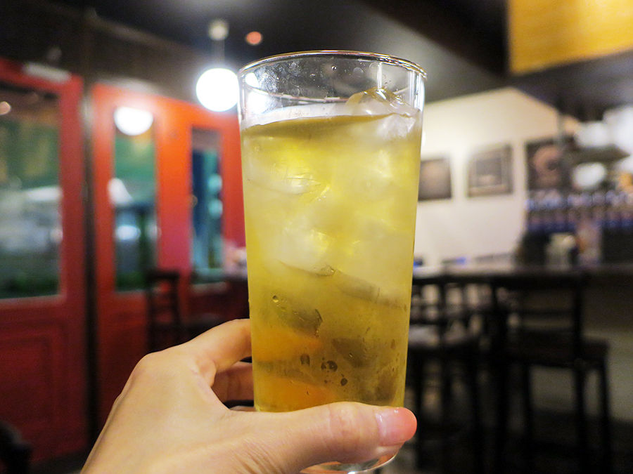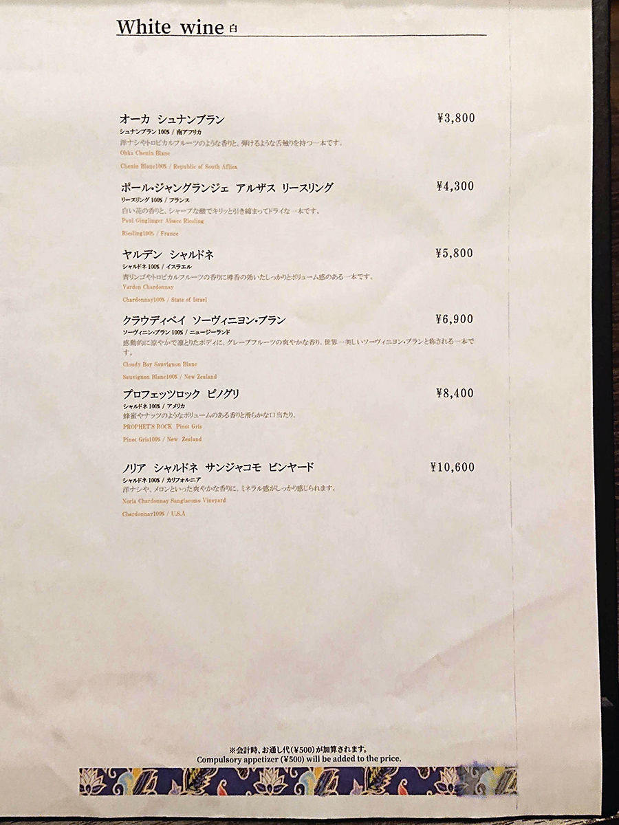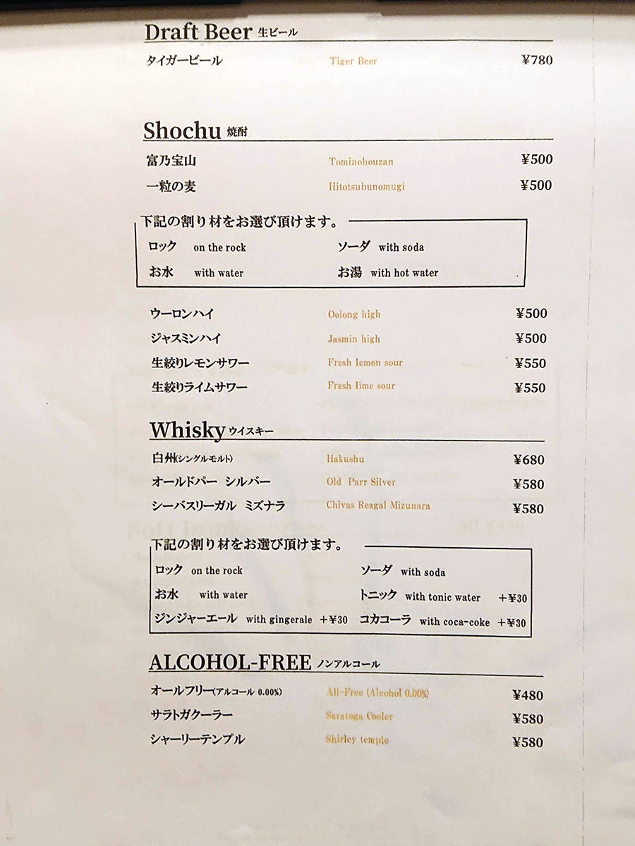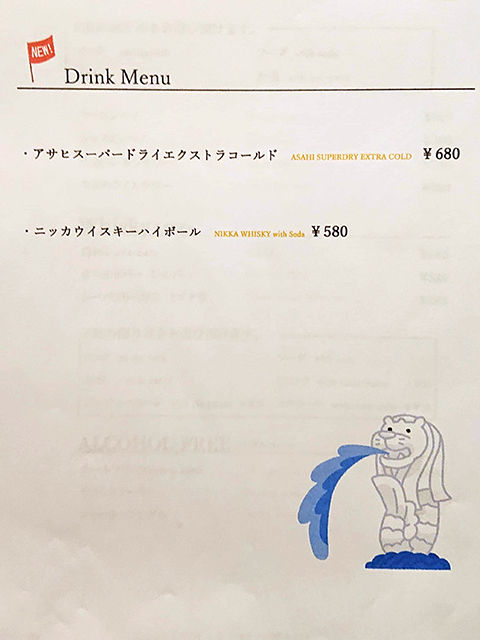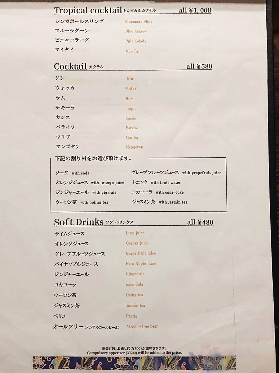 さて。テーブル席にオジャマしまして。メニューは手元用紙にて。ウリのラクサをメインに、おつまみ一品、前菜、メイン料理、サイドメニューなど割とシンプルなラインナップ。合わせるお酒は、定番に加えカクテルやワインが充実。(詳細は記事最下部にてどうぞ。以下、価格は税別。)