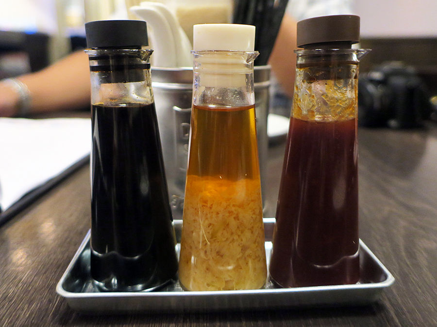 テーブルスタンバイの調味料。濃い醤油・生姜ダレ・海鮮ダレ。これをアテに飲んだりしてね(笑)