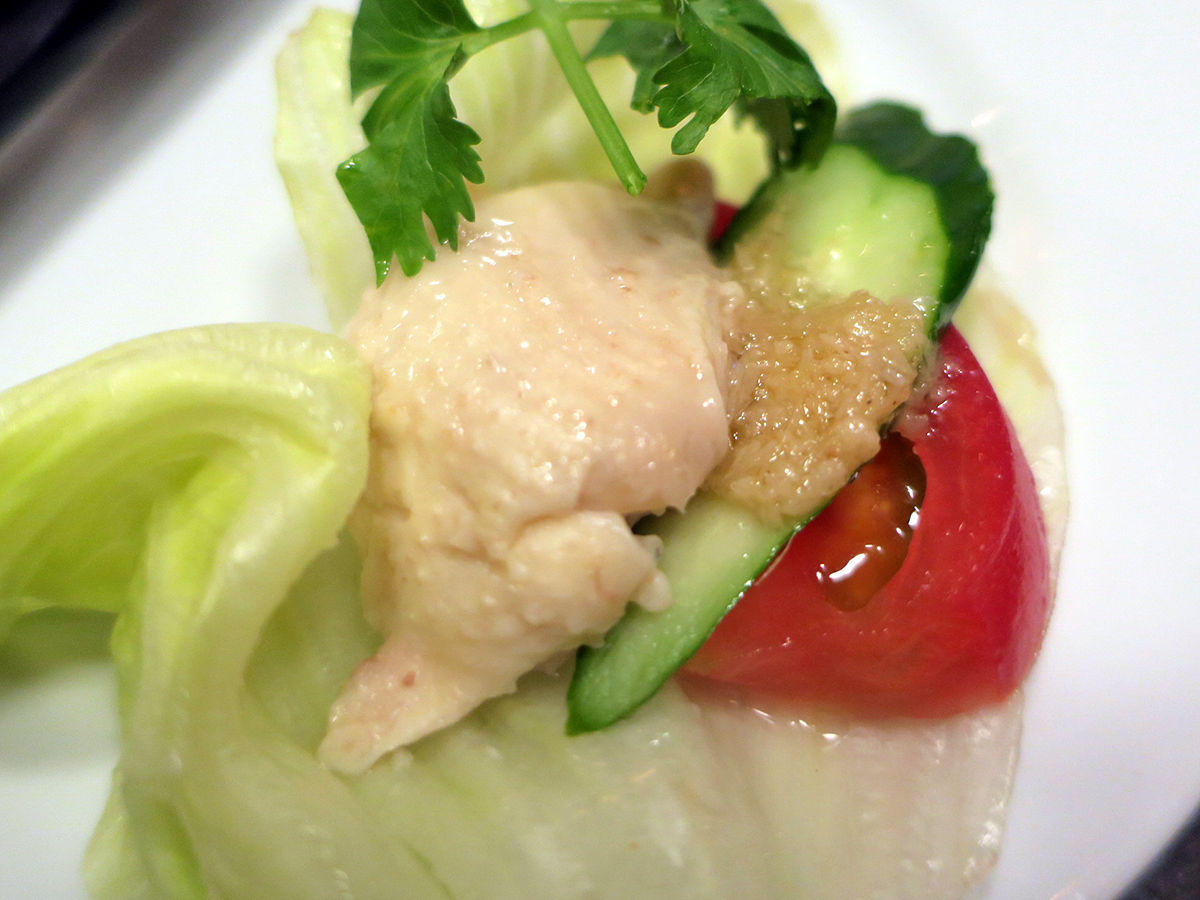 パクチーやトマトと一緒にレタスに乗っけて、ジンジャーたっぷりのタレをかけて。
