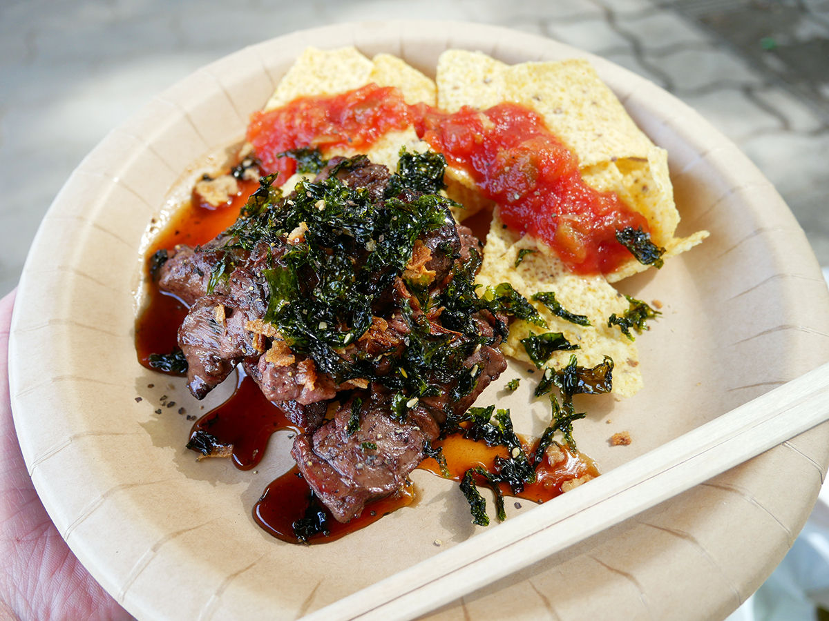 kushiage010/IG牛肉のハラミ焼き。お肉はジューシィでアオサのソース(多分)もおいしい。チケット3枚(¥1000ちょい)