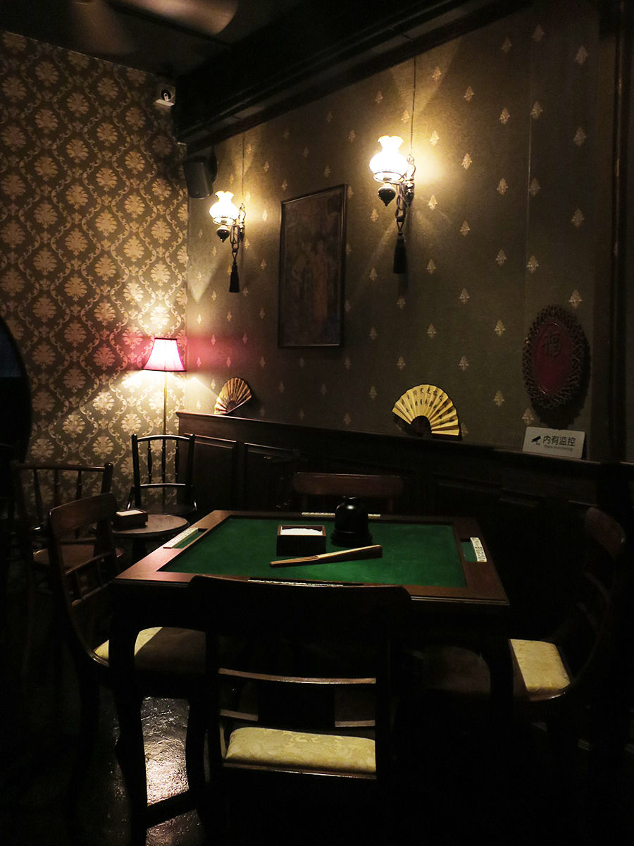 酒瓶とグラスがずらり並ぶカウンターの他、金持ちの中国風っぽい色んなスタイルの席が設けられている。ギャンブルやりそうな席もある。