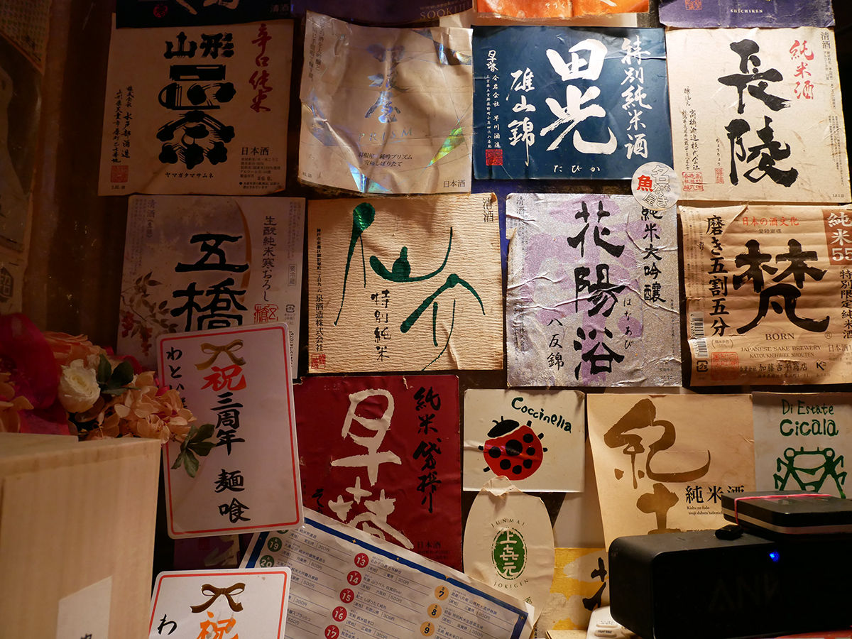 と、途中、空いたカウンターに招き入れて下さり席移動。目の前には日本酒ラベルがズラリ。