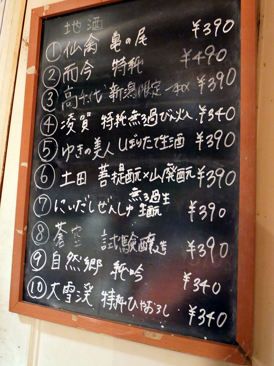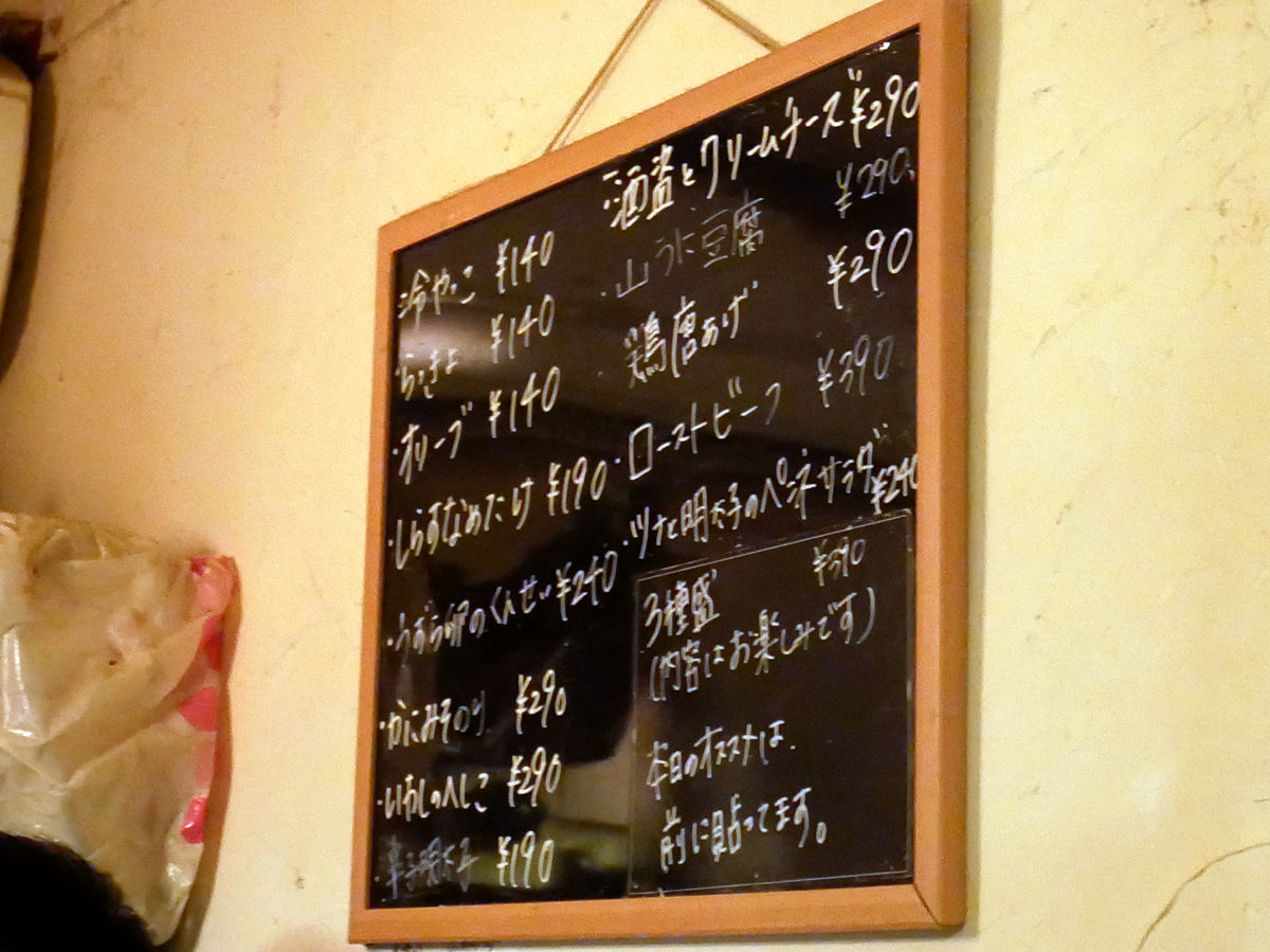 メニューは店内あちこちの壁にて。ドリンクひと通りに加え、日本酒が10種類ほど。アテはそれほど種類豊富ではないものの、酒飲みの心を掴むイキな一品が揃います。(以下、価格は税込。)