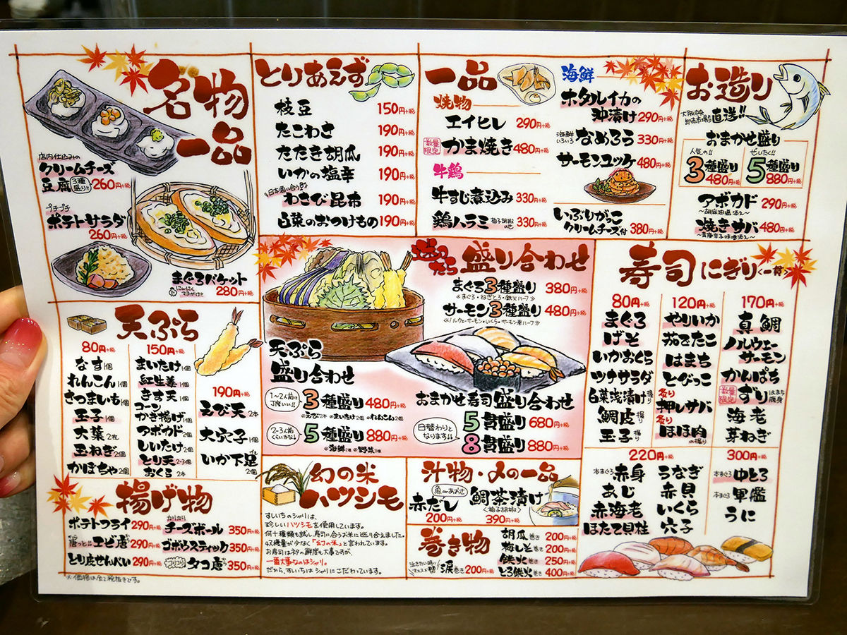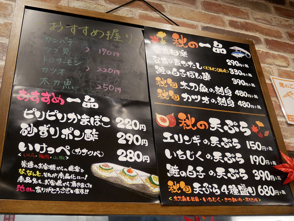 メニューは手元パウチと店内短冊や黒板にて。メインのお寿司は¥80〜、全て一貫からオーダー可能が嬉しい。その他、おつまみ一品、お造り、天ぷらなども、定番に加え季節ものも揃います。