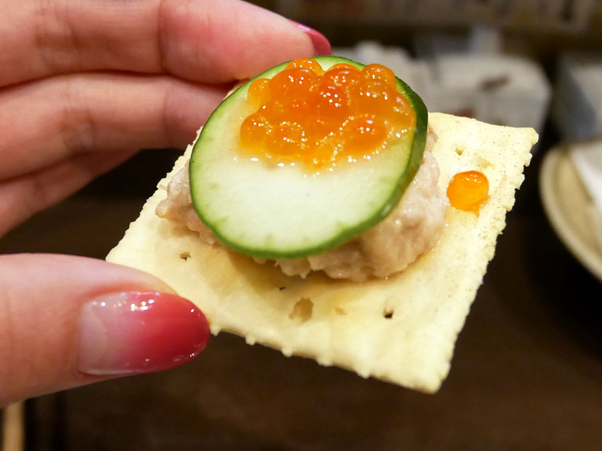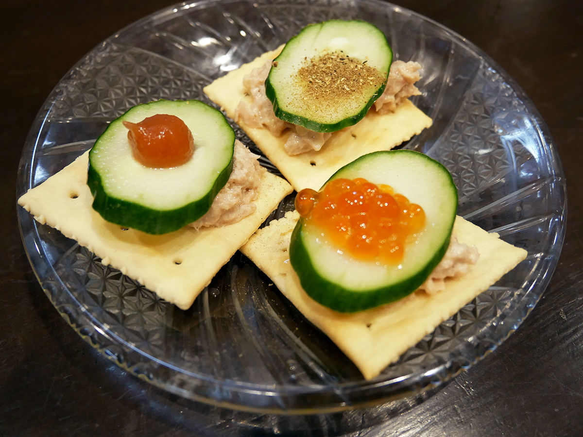 クラッカーにツナマヨ&キュウリベース、それぞれに、いくら・梅肉・山椒がオンザ。まぁ間違いないね。