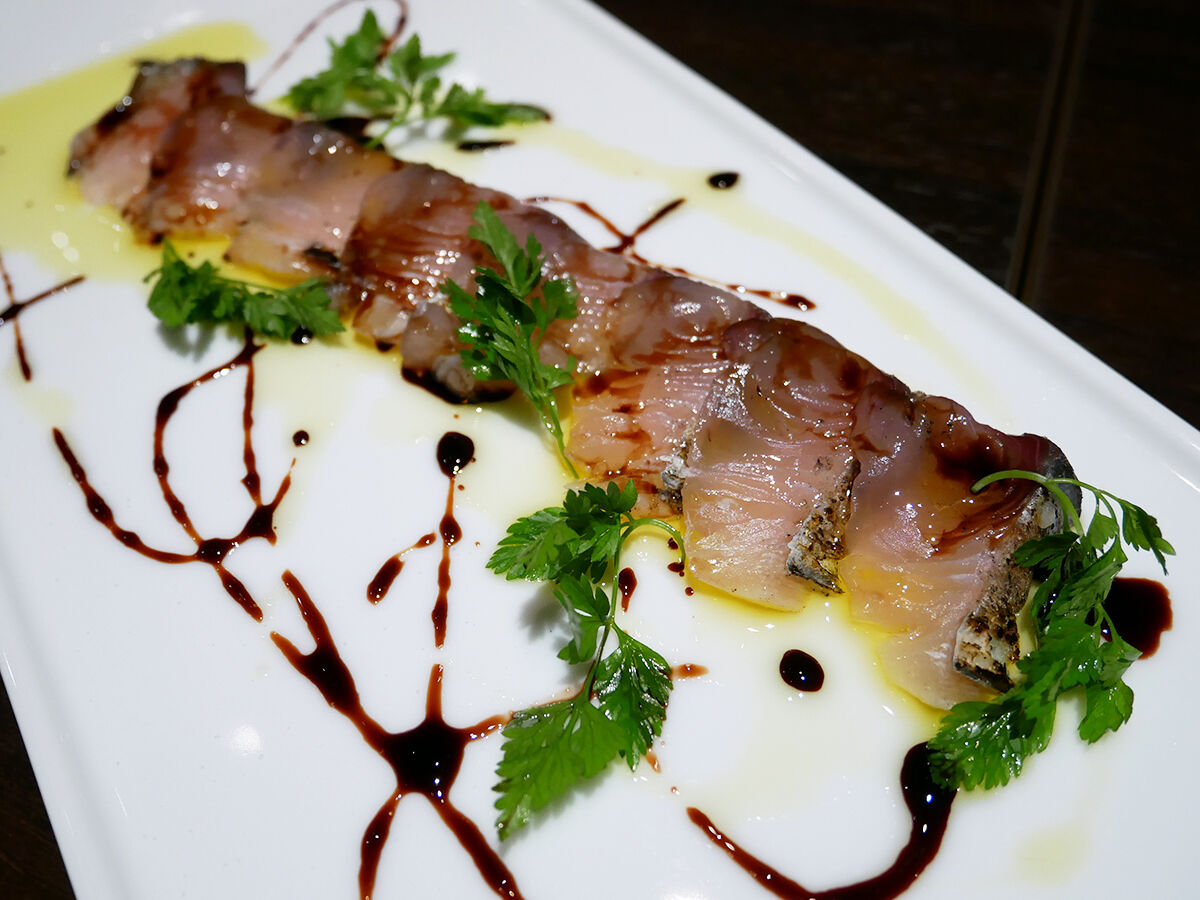 オリーブオイルとバルサミコソースで、お醤油で食べるお刺身とはガラリ印象が変わるからおもしろい。そして泡が進む。